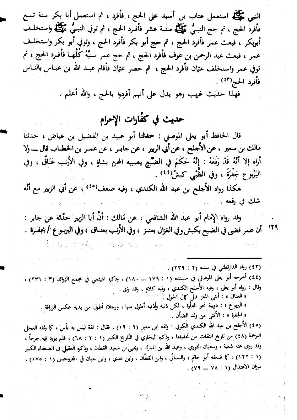 النبى صلى الله عليه وسلم استعمل عتاب بن اسيد على الحج فأفرد ثم استعمل ابا بكر سنة تسع فأفرد الحج ثم حج النبى صلى الله عليه وسلم سنة عشر فأفرد الحج ثم توفى النبى صلى الله عليه وسلم واستخلف ابو بكر فبعث عمر فأفرد الحج ثم حج ابو بكر فأفرد الحج وتوفى ابو بكر واستخلف عمر فبعث عبد الرحمن بن عوف فأفرد الحج ثم حج عمر سنية كلها فأفرد الحج ثم توفى عمر واستخلف عثمان فأفرد الحج ثم حصر عثمان فأقام عبد الله بن عباس بالناس فأفرد الحج فهذا حديث غريب وهو يدل على انهم افردوا بالحج والله اعلم حديث فى كفارات الاحرام قال الحافظ ابو يعلى الموصلى حدثنا ابو عبيد بن الفضل بن عياض حدثنا مالك بن سعير عن الاجلح عن ابى الزبير عن جابر عن عمر بن الخطاب قال ولا اراه الا انه قد رفعه انه حكم فى الضبع يصيبه المحرم بشاة وفى الارنب عناق وفى اليربوع جفرة وفى الظبى كبش هكذا رواه الاجلح بن عبد الله الكندى وفيه ضعيف عن ابى الزبير مع انه شك فى رفعه وقد رواه الامام ابو عبد الله الشافعى عن مالك انابا الزبير حدثه جابر ان عمر قضى فى الضيع بكبش وفى الغزال بعنز وفى الارنب بعناق وفى اليربوع بجفرة