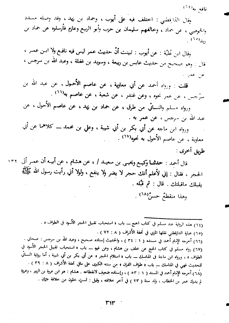 نافع به وقال الدارقطنى اختلف فيه على ايوب وحماد بن زيد وقد وصله مسدد والحوضى عن حماد وخالفهم سليمان بن حرب وابو الربيع وعازم فأرسلوه عن حماد بن زيد قال ابن علية عن ايوب تبينت ان حديث عمر ليس فيه نافع ولا ابن عمر قال وهو صحيح من حديث عابس بن ربيعة وسويد بن غفلة وعبد الله بن سرجس عن عمر قلت ورواه احمد بن ابى معاوية عن عاصم الاحول عن عبد الله بن سرجس عن عمر نحوه وعن غندر عن شعبة عن عاصم به ورواه مسلم والنسائى من طرق عن حماد بن زيد عن عاصم الاحول عن عبد الله بن سرجس عن عمر به ورواه ابن ماجة عن ابى بكر بن ابى شيبة وعلى بن محمد كلاهما عن ابى معاوية عن عاصم الاحول به نحوه طريق اخرى قال احمد حدثنا وميع ويحيى بن سعيد عن هشام عن ابيه ان عمر انى الحجر فقال انى لأعلم انك حجر لا يضر ولا ينفع ولا انى رايت رسول الله صلى الله عليه وسلم يقبلك ما قبلتك قال ثم قبله وهذا منقطع حسن