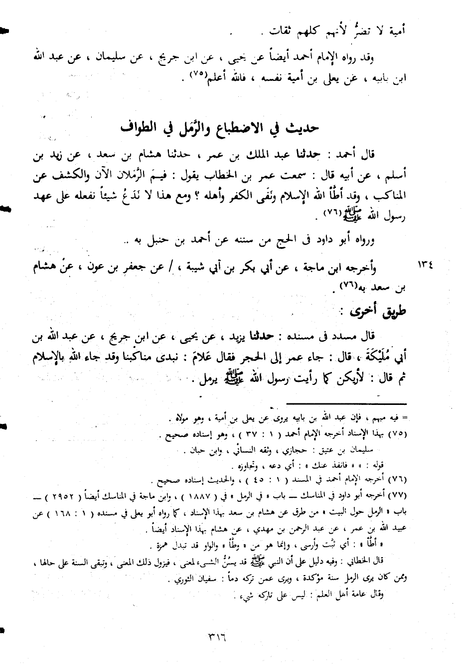 أمية لا تضر لأنهم كلهم ثقات وقد رواه الإمام أحمد أيضا عن يحيى عن ابن جريح عن سليمان عن عبد الله ابن بابيه عن يعلى بن أمية نفسه فالله أعلم حديث في الاضطباع والرمل في الطواف قال أحمد حدثنا عبد الملك بن عمر حدثنا هشام بن سعد عن زيد بن أسلم عن أبيه قال سمعت عمر بن الخطاب يقول فيم الرملان الأن والكشف عن المناكب وقد أطأ الله الإسلام ونفي الكفر وأهله ومع هذا لا ندع شيئا نفعله على عهد رسول الله صلى الله عليه وسلم ورواه ابو داود فى الحج من سننة عن احمد بن حنبل به واخرجه ابن ماجة عن ابى بكر بن ابى شبيبة عن جعفر بن عون عن هشام بن سعد به طريق اخرى قال مسدد فى مسنده حدثنا يزيد عن يحيى عن ابن جريح عن عبد الله بن ابى مليكة قال جاء عمر الى الحجر فقال علام نبدى مناكبنا وقد جاء الله بالاسلام ثم قال لأربكن كما رايت رسول الله صلى الله عليه وسلم يرمل