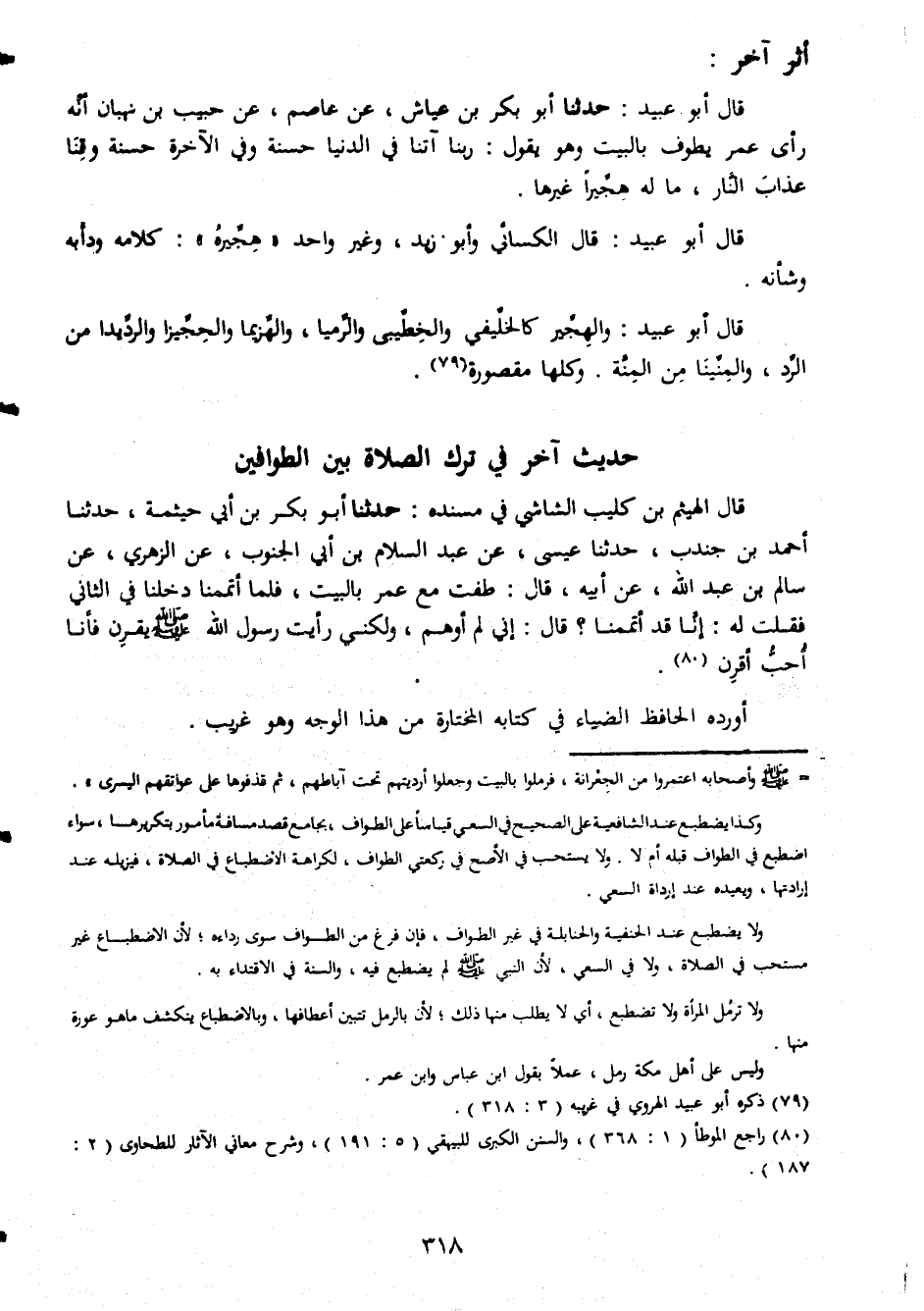أثر اخر قال ابو عبيد حدثنا ابو بكر بن عياش عن عاصم عن حبيب بن شهبان انه راى عمر يطوف بالبيت وهو يقول ربنا آتنا فى الدنيا حسنة وفى الآخرة حسنة وقنا عذاب النار ماله هجيرا غيرها قال ابو عبيد قال الكسائى وابو زيد وغير واحد هجيره كلامه ودأبه وشأنه قال ابو عبيد والهجير كالخليفى والخطبى والرميا والهزيما والحجيزا والرديدا من الرد والمنينا من المنة وكلها مقصورة حديث اخر فى ترك الصلاة بين الطوافين قال الهيثم بن كليب الشاشى فى مسنده حدثنا ابو بكر بن ابى حيثمة حدثنا احمد بن جندب حدثنا عيسى عن عبد السلام بن ابى الجنوب عن الزهرى عن سالم بن عبد الله عن ابيه قال طفت مع عمر بالبيت فلما اتممنا دخلنا فى الثانى فقلت له انا قد اتممنا قال انى لم أوهم ولكنى رايت رسول الله صلى الله عليه وسلم يقرن فأننا احب أقرن اورده الحافظ الضياء فى كتابه المختارة من هذا الوجه وهو غريب