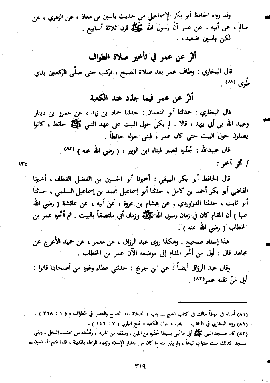 وقد رواه الحافظ ابو بكر الاسماعيلى من حديث ياسين بن معاذ عن الزهرى عن سالم عن ابيه عن عمر ان رسول الله صلى الله عليه وسلم قرن ثلاثة أسابيع لكن ياسين ضعيف أثر عن عمر فى تاخير صلاة الطواف قال البخارى وطاف عمر بعد صلاة الصبح فركب حتى صلى ركعتين بذى طوى أثر عن عمر فيما جدد عند الكعبة قال البخارى حدثنا ابو النعمان حدثنا حماد بن زيد عن عمرو بن دينار وعبيد الله بن ابى يزيد قالا لم يكن حول البيت على عهد النبى صلى الله عليه وسلم حائط كانوا يصلون حول البيت حتى كان عمر فبنى حوله حائطا قال عبيد الله جدره قصير فبناه ابن الزبير رضى الله عنه اثر اخر قال الحافظ ابو بكر البيهقى اخبرنا ابو الحسين بن الفضل القطان اخبرنا القاضى ابو بكر احمد بن كامل حدثنا ابو اسماعيل محمد بن اسماعيل السلمى حدثنا ابو ثابت حدثنا الدراوردى عن هشام بن عروة عن ابيه عن عائشة رضى الله عنها ان المقام كان فى زمان رسول الله صلى الله عليه وسلم وزمان ابى ملتصقا بالبيت ثم اخبره عمر بن الخطاب رضى الله عنه وهذا اسناد صحيح وهكذا روى عبد الرزاق عن معمر عن حميد الاعرج عن مجاهد قال اول من اخر المقام الى موضعه الان عمر بن الخطاب وقال عبد الرزاق ايضا عن ابن جريح حدثنى عطاء وغيره من أصحابنا قالوا اول من نقله عمر