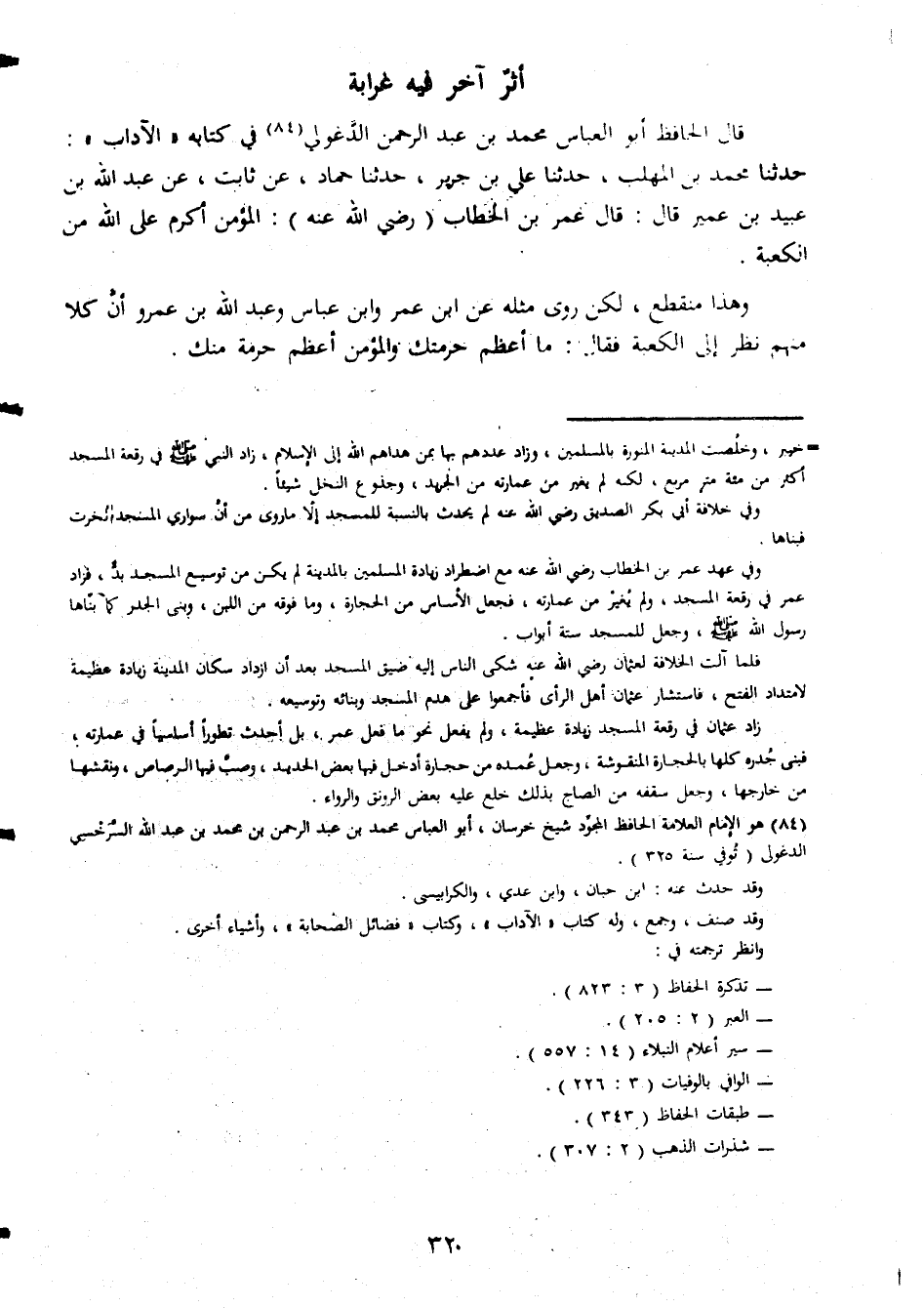 أثر اخر فيه غرابة قال الحافظ ابو العباس محمد بن عبد الرحمن الدغولى فى كتابه الآهاب حدثنا محمد بن المهلب حدثنا على بن جرير حدثنا حماد عن ثابت عن عبد الله بن عبيد بن عمير قال قال عمر بن الخطاب رضى الله عنه المؤمن اكرم على الله من الكعبة وهذا منقطع لكن روى مثله عن ابن عمر وابن عباس وعبد الله بن عمرو ان كلا منهم نظر الى الكعبة فقال ما اعظم حرمتك والمؤمن اعظم جرمة منك