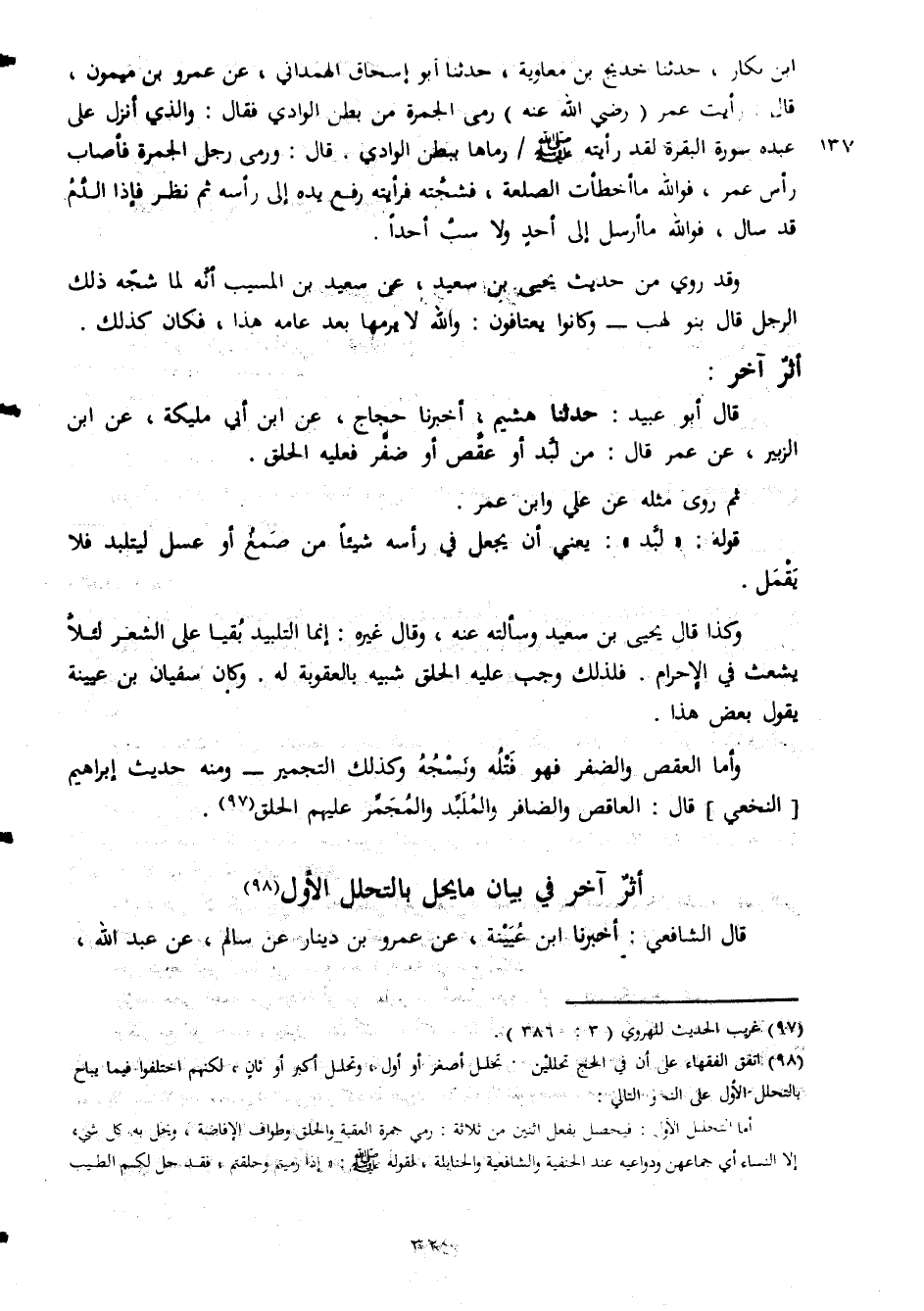 ابن بكار حدثنا خديج بن معاوية حدثنا ابو اسحاق الهمدانى عن عمرو بن ميمون قال رايت عمر رضى الله عنه رمى الجمرة من بطن الوادى قال رمى رجل الجمرة فأصاب راس عمر فو الله ما أخطأت الصلعة فشجته فرأيته رفع يديه الى راسه ثم نظر فإذا الدم قد سال فو الله ما ارسل الى احد ولا سب احدا وقد روى من حديث يحيى بن سعيد عن سعيد بن المسيب انه لما شجة ذلك الرجل قال بنو لهب وكانوا يعتافون والله لا يرمها بعد عامه هذا فكان كذلك اثر اخر قال ابو عبيد حدثنا هشيم اخبرنا حجاج عن ابن مليكة عن ابن الزبير عن عمر قال من لبد او عقص او ضفر فعليه الحلق ثم روى مثله عن على وابن عمر قوله لبد يعنى ان يجعل فى راسه شيئا من صم عاو عسل ليتلبد فلا يقمل وكذا قال يحيى بن سعيد وسألته عنه وقال غيره انما التلبيد بقيا على الشعر لئلا يشعت فى الاحرام فلذلك وجب عليه الحلق شيبه بالعقوبة له وكان سفيان بن عيينة يقول بعض هذا واما العقص والضفر فهو قتله ونسجه وكذلك التجمير ومنه حديث ابراهيم النخعى قال العاقص والضافر والملبد والمجمر عليهم الحلق اثر اخر فى بيان ما يحل بالتحح الاول قال الشافعى اخبرنا ابن عيينة عن عمرو بن دينار عن سالم عن عبد الله