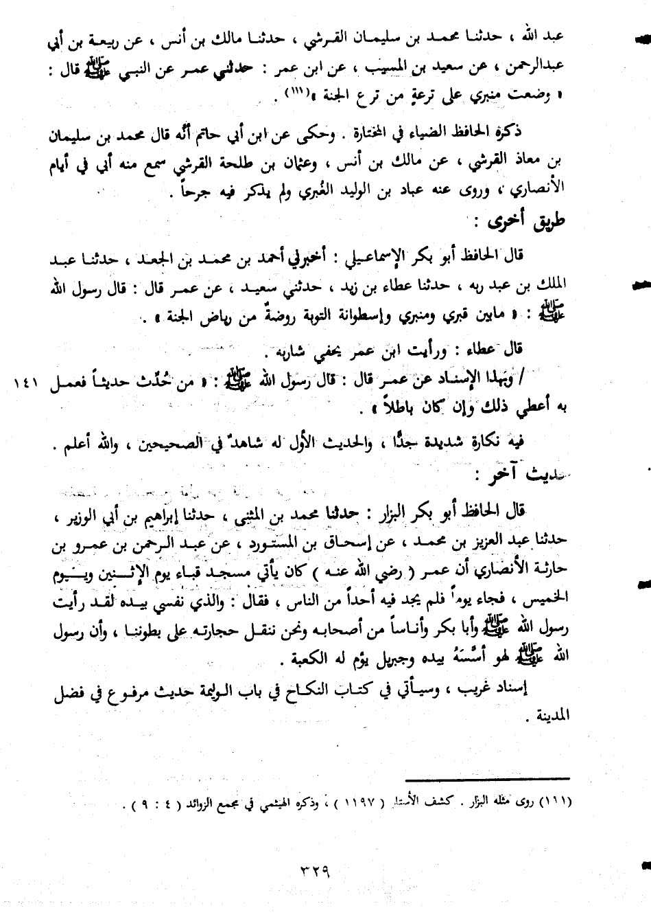 عبد الله حدثنا محمد بن سليمان القرشى حدثنا مالك بن انس عن ربيعة بن ابى عبد الرحمن عن سعيد بن المسيب عن ابن عمر حدثنى عمر عن النبى صلى الله عليه وسلم قال وضعت منيرى على ترعة من ترع الجنة ذكره الحافظ الضياء فى المختارة وحكى عن ابن ابى حاتم انه قال محمد بن سليمان بن معاذ القرشى عن مالك بن انس وعثمان بن طلحة القرشى سمع منه ابى فى ايام الانصارى وروى عنه عياد بن الوليد الغبرى ولم يذكر فيه جرحا طريق اخرى قال الحافظ ابو بكر الاسماعيلى اخبرنى احمد بن محمد بن الجعد حدثنا عبد الملك بن عبد ربه حدثنا عطاء بن زيد حدثنى سعيد عن عمر قال قال رسول الله صلى الله عليه وسلم ما بين قبرى ومنبرى واسطوانة التوبة روضة من رياض الجنة قال عطاء ورايت ابن عمر يخفى شاربة وبهذا الاسناد عن عمر قال قال رسول الله صلى الله عليه وسلم من حدث حديثا فعمل به اعطى ذلك وان كان باطلا فيه نكارة شديدة جدا والحديث الاول له شاهد فى الصحيحين والله اعلم حديث اخر قال الحافظ ابو بكر البزار حدثنا محمد بن المثنى حدثنا ابراهيم بن ابى الوزير حدثنا عبد العزيز بن محمد عن اسحاق بن المستورد عن عبد الرحمن بن عمرو بن حارثة الانصارى ان عمر رضى الله عنه كان ياتى مسجد قباء يوم الاثنين ويوم الخميس فجاء يوما فلم يجد فيه احدا من الناس فقال والذى نفسى بيده لقد رايت رسول الله صلى الله عليه وسلم وابا بكر واناسا من اصحابه ونحن ننقل حجارته على بطوننا وان رسول الله صلى الله عليه وسلم لهو اسسه بيده وجبريل يوم له الكعبة اسناد غريب وسياتى فى كتاب النكاح فى باب الوليمة حديث مرفوع فى فضل فى فضل المدينة