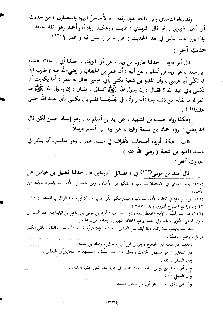 وقد رواه الترمذي وابن ماجة بدون رفعه لأخرجن اليهود والنصارى من حديث أبي احمد الزبيري ثم قال الترمذي غريب وهكذا رواه أبو أحمد وهو ثقة حافظ والمشهور عند الناس في هذا الحديث عن جابر ليس فيه عمر حديث أخر قال أبو داود حثنا هارون بن زيد عن أبي الزرقاء حدثنا أبي حدثنا هشام ابن سعد عن زيد بن أسلم عن أبيه أن عمر بن الخطاب رضي الله عنه ضرب ابنا له تكنى بأبي عيسى وأن المغيرة بن شعبة تكني أبا عيسى فقال له عمر اما كيفك أن تكتنى بأبيعبد الله فقال إن رسول الله صلى الله عليه وسلم كناني فقال إني رسول الله صلى الله عليه وسلم قد غفر له ماتقدم من ذنبه وما تأخر وأنافي جاجبتنا فلم يزل يكنى بابي عبد الله حتى هلك وهكذا رواه حبيب بن الشهيد عن زيد بن أسلم به وهو إسناد حسن لكن قال الدارقطني رواه حماد بن سلمة وغيره عن زيد بن أسلم مرسلا قلت هكذا أورده أصحاب الأطراف فى مسند عمر وهو مناسب ان يذكر فى مسند المغيرة بن شعبة رضى الله عنه حديث اخر قال اسد بن موسى فى فضائل الشيخين حدثنلا فضيل بن عياض عن