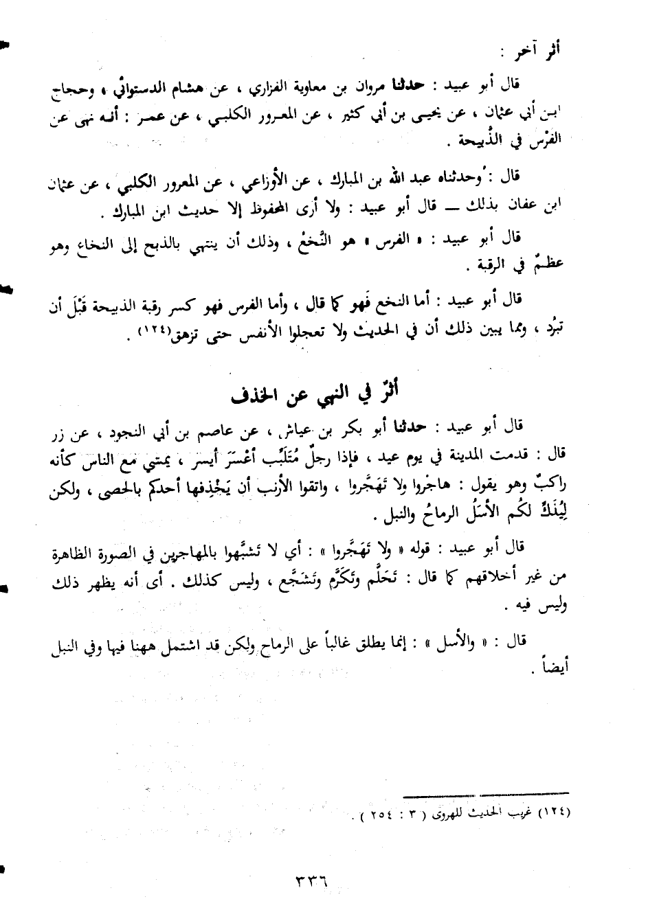 اثر اخر قال ابو عبيد حدثنا مروان بن معاوية الفزارى عن هشام الدستوائى وحجاج ابن ابى عثمان عن يحيى بن ابى كثير عن المعرور الكلبى عن عمر انه نهى عن الفرس فى الذبيحة قال وحدثناه عبد الله بن المبارك عن الاوزاعى عن المعرور الكلبى عن عثمان ابن عفان بذلك قال ابو عبيد ولا ارى المحفوظ الا حديث ابن المبارك قال ابو عبيد الفرس هو النخع وذلك ان ينتهى بالذبح الى النخاع وهو عظم الرقبة قال ابو عبيد اما النخع فهو كما قال واما الفرس فهو كسر رقبة الذبيحة قبل ان تبرد ومما يبين ذلك ان فى الحديث ولا تعجلوا الانفس حتى تزهق اثر فى النهى عن الخذف قال ابو عبيد حدثنا ابو بكر بن عياش عن عاصم بن ابى النجود عن زر قال قدمت المدينة فى يوم عيد فاذا رجل متلبب اعسر ايسر يمتى مع الناس كانه راكب وهو يقول هاجروا ولا تهجروا واتقوا الارنب ان يخذفها احدكم بالحصى ولكن ليذك لكم الرماح والنيل قال ابو عبيد قوله ولا تهجروا اى لا تشبهوا بالمهاجر فى الصورة الظاهرة من غير اخلاقهم كما قال تحلم وتكرم وتشجع وليس كذلك اى انه يظهر ذلك وليس فيه قال والاسل انما يطلق غالبا على الرمال ولكن قد اشتمل ههنا فيها وفى النيل ايضا
