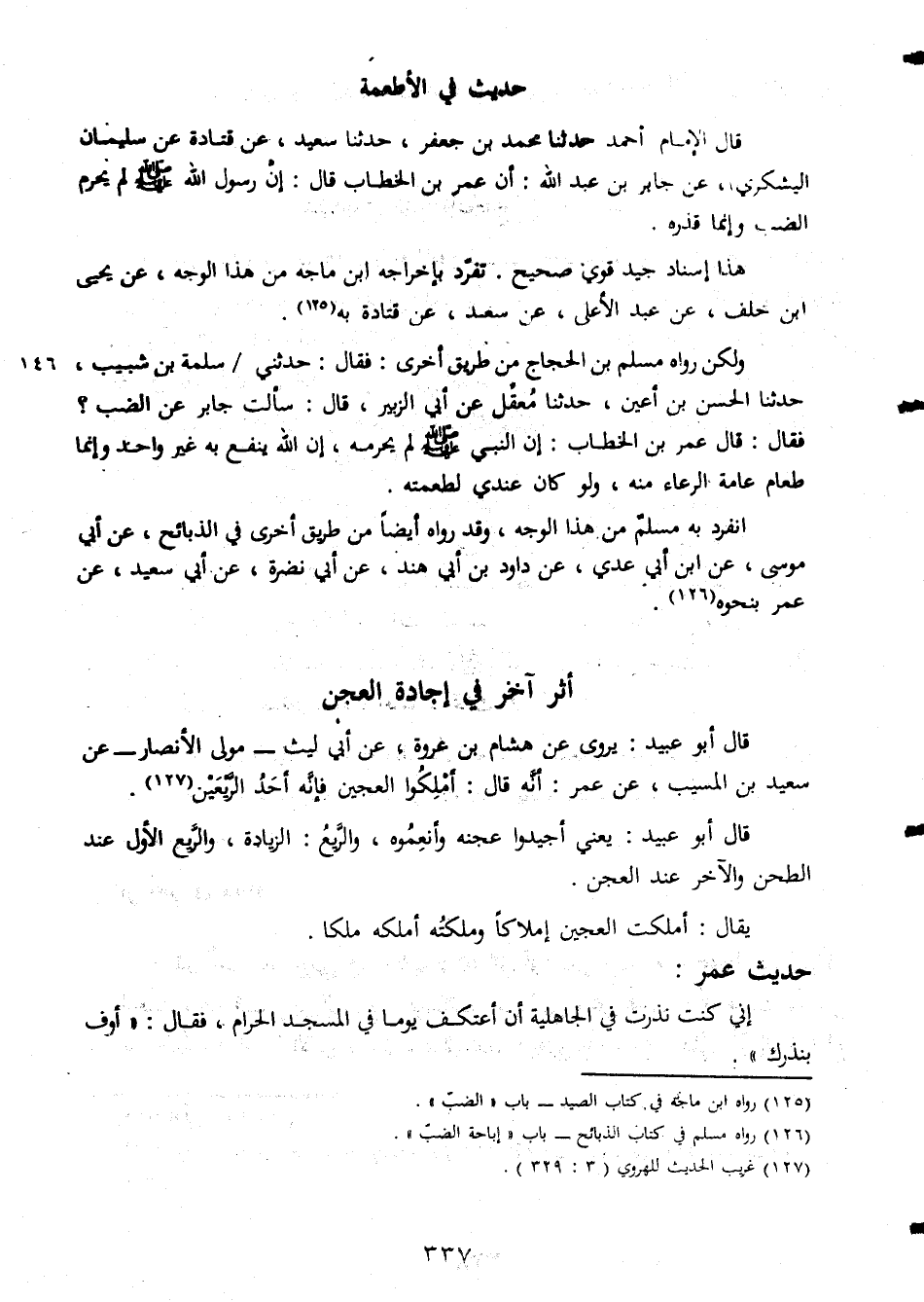 حديث فى الاطمعة قال الامام احمد حدثنا محمد بن جعفر حدثنا سعيد عن قتادة عن سليمان اليشكري عن جابر بن عبد الله ان عمر بن الخطاب قال ان رسول الله صلي الله علية وسلم لم يحرم الضب وانما قذره هذا اسناد جيد قوي صحيح تفرد باخراجه ابن ماجه من هذا الوجه عن يحيي ابن خلف عن عبد الاعلي عن سعد عن قتادة به ولكن رواه مسلم بن الحجاج من طريق اخري فقال حدثني سلمة بن شبيب حدثنا الحسن بن اعين حدثننا معقل عن ابى الزبير قال سالت جابر عن الضب فقال قال عمر بن الخطاب ان النبي صلي الله علية وسلم لم يحرمه ان الله ينفع به واحد ونما طعام عامة الرعاء منه ولو كان عندي اطعمته انفرد به مسلم من هذا الوجه وقد رواه ايضا من طريق اخرى في الذبائح عن ابي موسى عن ابن ابى عدى عن داود بن ابى هند عن ابى نضوة عن ابى سعيد عن عمر بنحوه اثر اخر في اجادة العجن قال ابو عبيد يروى عن هشام بن عروة عن ابى ليث مولي الانصار عن سعيد بن المسيب عن عمر انه قال املكوا العجين فانه احد الريعين قال ابو عبيد يعنى اجيدوا عجنه وانعموه والربيع والزيادة والربع الاول عند الطحن والاخر عند العجن يقال املكت العجين املاكا وملكته املكه ملكا حديث عمر انى كنت نذرت فى الجاهلية ان اعتكف يوما فى المسجد الحرام فقال اوف بنذرك