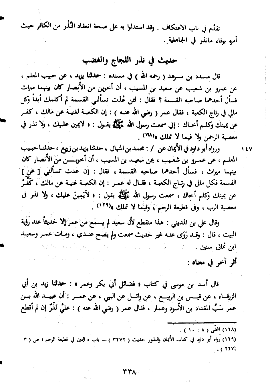 تقدم فى باب الاعتكاف وقد استدلوا به على صحة انعقاد النذر من الكافر حيث امره بوفاء ما نذر فى الجاهلية حدبث فى نذر اللجاج والغضب قال مسدد بن مسرهد رحمه الله فى مسنده حدثنا يزيد عن حبيب المعلم عن عمرو بن شعيب عن سعيد بن المسي بان اخوين من الانصار كان بينهما ميراث فسأل احدهما صاحبه القسمة فقال لئن عدت تسألنى القسمة لم اكلم كابدا وكل مالى فى رتاج الكعبة فقال عمر رضى الله عنه ان الكعبة لغنية عن مالك كفر عن يمينك وكلم اخاك انى سمعت رسول الله صلى الله عليه وسلم يقول لا يمين عليك ولا نذر فى معيصة الرحمن ولا فيما لا تملك ورواه ابو داود فى الايمان عن محمد بن المنهال حدثنا يزيد بن زريع حدثنا حبيب المعلم عن عمرو بن شب عن سعيد بن المسي بان اخوين من الانصارى كان بينهما ميراث فسأل احدهما صاحبه القسمة فقال ان عدت تسألنى عن القسمة فكل مالى فى وتاج الكعبة فقال له عمر ان الكعبة غنية عن مالك كفر عن يمينك وكلم اخاك سمعت رسول الله صلى الله عليه وسلم يقول لأيمين عليك ولا نذ ر فى معصية الرب وفى قطيعة الرحم وفيما لا تملك وقال على بن المدينى هذا منقطع لأن سعيد لم يسمع من عمر الا حديثا عند رؤية البيت قال وقد روى عنه غير حديث سمعت ولم يصح عندى ومات عمر وسعيد ابن ثمانى سنين أثر آخر فى معناه قال اسد بن موسى فى كتاب فضائل ابى بكر وعمر حدثنا زيد بن ابى الزرقاء عن قيس بن الربيع عن وائل عن البهى عن عمر ان عبيد الله بن عمر سب المقداد بن الاسود وعمار رضى الله عنه على نذر ان لم اقطع