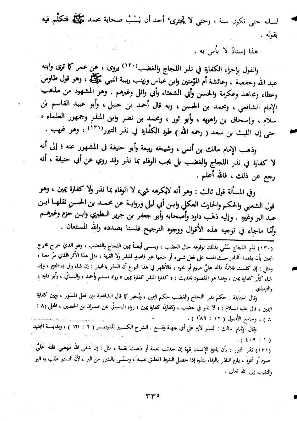 لسانه حتى تكون وحتى لا يجترىء احد ان يسب صحابه محمد صلى الله عليه وسلم فتكلم فيه بقوله هذا اسناد لا بأس به والقول بإجراء الكفارة فى نذر اللجاج والغضب يروى عن عمر كما يروى عن عمر كما ترى وابنه عبد الله وحفصة وعائشة أم المؤمنين وابن عباس وزينب ربيبة النبي صلى الله عليه وسلم وهو قول طاوس وعطاء ومجاهد وعكرمة والحسن وأبي الشعثاء وأبي وائل وغيرهم وهو المشهود مذهب الإمام الشافعى ومحمد بن الحسن وبه قال احمد بن حنبل وابو عبيد القاسم بن سلام واسحاق بن راهوية وابو ثور ومحمد بن نصر وابن المنذر وجمهور العلماء حتى ان الليث بن سعد رحمه الله طرد الكفارة فى نذر التبرر وهو غريب وذهب ؤالامام مالك بن انس وشيخه ربيعه وابو حنيفة فى المشهور عنه الى انه لا كفارة فى نذر اللجاج والغضب بل يجب الوفاء بما نذر وقد روى عن ابى حنيفة انه رجع عن ذلك والله اعلم وفى المسألة قول ثالث وهو انه لا يكرهه شىء لا الوفاء بما نذر وكفارة يمين وهو قول الشعبى والحكم والحارث العكلى وابن ورواية عن محمد بن الحسن نقلها ابن عبد البر وغيره واليه ذهب داود واصحابه وابو جعفر بن جرير الطيرى وابن حزم وغيرهم واما ما جاء فى توجيه هذه الاقوال ووجوه الترجيح فلسنا بصدده والله المستعان