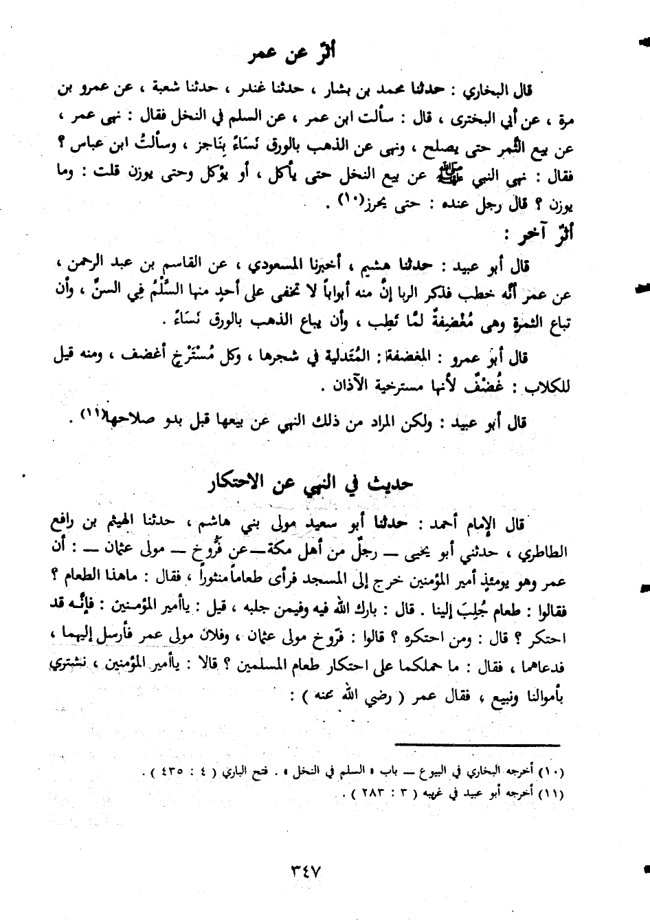 اثر فى عمر قال البخارى حدثنا محمد بن بشار حدثنا غندر حدثنا شعبة عن عمرو بن مرة عن ابى البخترى قال سألت ابن عمر عن السلم فى النخل فقال نهى عمر عن بيع الثمر حتى يصلح ونهى عن الذهب بالورق نساء بناجز وسألت ابن عباس فقال نهى النبى صلى الله عليه وسلم عن بيع النخل حتى يأكل او يؤكل وحتى يوزن قلت وما يوزن قال رجل عنده حتى يحرز أثر اخر قال ابو عبيد حدثنا هشيم اخبرنا المسعودى عن القاسم بن عبد الرحمن عن عمر انه خطب فذكر الربا ان منه ابوابا لا تخفى على احد منها السلم فى السن وان تباع الثمرة وهى مغضفة لما تطب وان يباع الذهب بالورق نساء قال ابو عمرو المغضفة والمتدليه فى شجرها وكل مسترخ أغضف ومنه قليل للكلاب غضف لأنها مسترخية الآذان قال ابو عبيد ولكن المواد من ذلك النهى عن بيعها قبل بدو صلاحها حديث فى النهى عن الاحتكار قال الامام احمد حدثنا ابو سعيد مولى بنى هاشم حدثنا الهيثم بن رافع الطاطرى حدثنى ابو يحيى رجل من أهل مكة عن فروخ مولى عثمان ان عمر وهو يومئد امير المؤمنين خرج الى المسجد فراى طعاما منثورا فقال ما هذا الطعام فقالوا طعام جلي بالينا قال بارك الله فيه وفيمن جلبه قيل يا امير المؤمنين فإنه قد احتكر قال ومن احتكره قالوا فروخ مولى عثمان وفلان مولى عمر فأرسل اليهما فدعاهما فقال ما حملكما على احتكار طعام المسلمين قالا يا امير المؤمنين نشترى باموالنا ونبيع فقال عمر رضى الله عنه