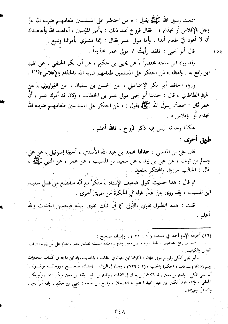 سمعت رسول الله صلى الله عليه وسلم يقول من احتكر على المسلمين طعامهم ضربه الله عز وجل بالافلاس او بجذام فقال فروخ عند ذلك يا امير المؤمنين اعاهد الله واعاهدك ان لا اعود فى طعام ابدا واما مولى عمر فقال انما نشترى باموالنا وابيع قال ابو يحيى فلقد رايت مولى عمر مجذوما وقد رواه ابن ماجة مختصرا عن يحيى بن حكيم عن ابى بكر الحنفى عن الهيثم ابن رافع به ولفظه من احتكر على المسلمين طعامهم ضربة الله بالجذام والافلاس ورواه الحافظ ابو بكر الاسماعيلى عن الحسن بن سفيان عن القواريرى عن الهيثم الطاطرنى قال حدثنا ابو يحيى مولى عمر بن الخطاب وكان قد ادرك عمر ان عمر قال سمعت رسول الله صلى الله عليه وسلم يقول من احتكر على المسلمين طعامهم ضربة الله بجذام او بافلاس هكذا وجدته ليس فيه ذكر فروخ فالله اعلم طريق اخرى قال على بن المدينى حدثنا محمد بن عبد الله الاسدى اخبرنا اسرائيل عن على وسالم بن ثوبان عن على بن زيد عن سعيد بن المسيب عن عمر عن النبى صلى الله عليه وسلم قال الجالب مرزوق والمحتكر ملعون ثم قال هذا حديث كوفى ضعيف الاسناد منكر مع انه منقطع من قبل سعيد ابن المسيب وقد روى عن عمر قوله فى الحكرة من طريق اخرى قلت هذه الطرق تقوى بالاولى كما ان تلك تقوى بالاولى كما ان تلك تقوى بهذه فيحسن الحديث والله اعلم