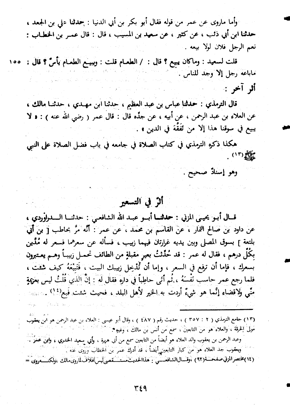 واما ماروى عن عمر من قوله فقال ابو بكر بن ابى الدنيا حدثنا على بن الجعد حدثنا ابن ابى ذئب عن كثير عن سعيد بن المسيب قال قال عمر بن الخطاب نعم الرجل فلان لولا بيعه قلت لسعيد وما كان يبيع قال الطعام قلت ويبيع الطعام بأس قال ما باعه رجل الا وجد للناس اثر آخر قال الترمذى حدثنا عباس بن عبد العظيم حدثنا ابن مهدى حدثنا مالك عن العلاء بن عبد الرحمن عن ابيه عن جده قال قال عمر رضى الله عنه لا يبيع فى سوقنا هذا الا من تفقه فى الدين هكذا ذكره الترمذى فى كتاب الصلاة فى جامعة فى باب فضل الصلاة على النبى صلى الله عليه وسلم وهو اسناد صحيح اثر فى التسعير قال ابو يحيى المزنى حدثنا ابو عبد الله الشافعى حدثنا الدراوردى عن داود بن صالح التمار عن القاسم بن محمد عن عمر انه مر بخاطب بن ابى بلتعة بسوق المصلى وبين يديه غرارتان فيهما زبيب فسأله عن سعرهما فسعر له مدين بكل درهم فقال له عمر قد حدثت بعير مقبلة من الطائف تحمل زبيبا وهو يعتبرون بسعرك فإما ان ترفع فى السعر واما ان تدخل زبيبك البيت فتبيعه كيف شئت فلما رجع عمر حاسب نفسه ثم اتى حاطبا فى داره فقال له انالذى قلت ليس بعزيمة منى ولا قضاء انما هو شىء اردت به الخير لأهل البلد فحيث شئت فبع