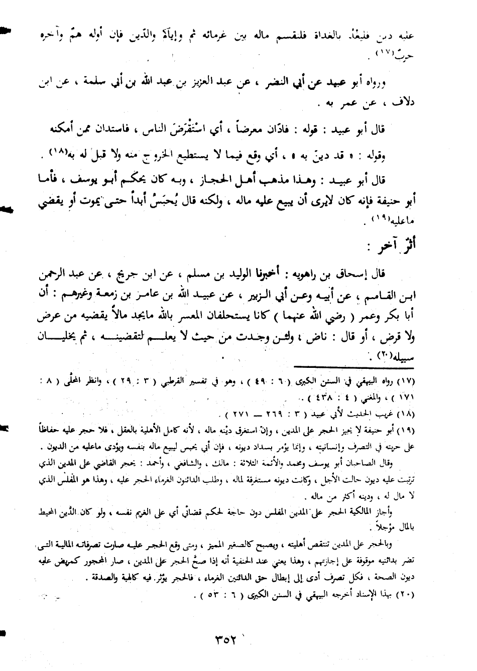 عليه دين فليعد بالغداة فلنقسم مائة بين غرمائه ثم واياكم والدين فإن اوله هم وآخره حرب ورواه ابو عبيد عن ابى النضر عن عبد العزيز بن عبد الله بن ابى سلمة عن ابن دلاف عن عمر به قال ابو عبيد قوله فادان معرضا اى استقرض الناس فاستدان ممن أمكنه وقوله قد دين به اى وقع فيما لا يستطيع الخروج منه ولا قبل له به قال ابو عبيد وهذا مذهب اهل الحجاز وبه كان يحكم ابو يوسف فأما ابو حنيفة فإنه كان لا يرى ان يبيع عليه ماله ولكنه يحبس ابدا حتى يموت او يقضى ما عليه أثر آخر قال اسحاق بن راهوية أخبرنا الوليد بن مسلم عن ابن جريح عن عبد الرحمن ابن القاسم عن ابيه وعن ابى الزبير عن عبيد الله بن عامر بن زمعة وغيرهم انابا بكر وعمر رضى الله عنهما كانا يستحلفان المعسر بالله ما يجد مالا يقضيه من عوض ولا قرض او قال ناض ولئن وجدت من حيث لا يعلم لتقضينة ثم يخليان سبيله