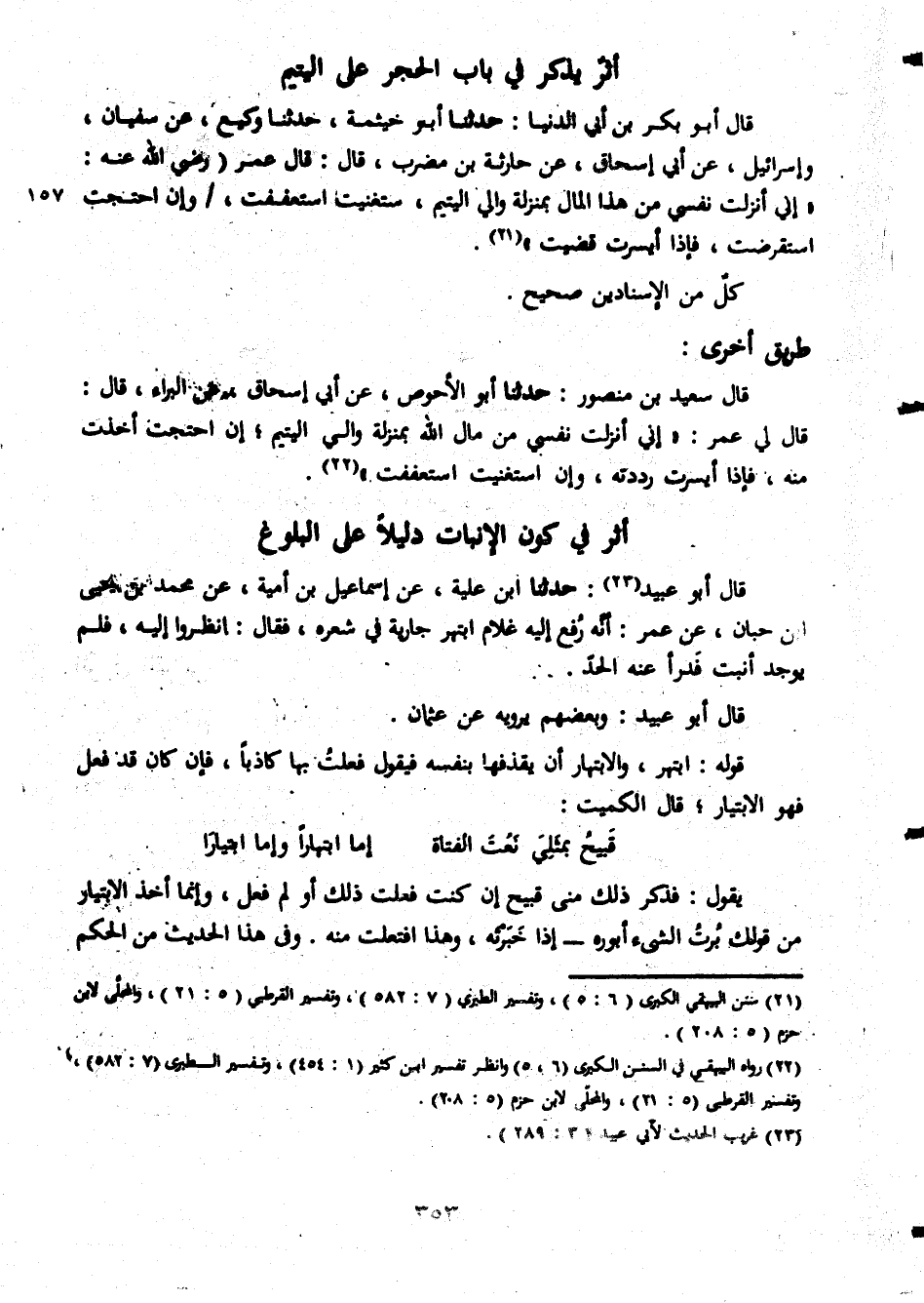 أثر يذكر فى باب الحجر على اليتيم قال ابو بكر بن ابى الدنيا حدثنا ابو خيثمة حدثنا وكيع عن سفيان واسرائيل عن ابى اسحاق عن حارثة بن مضرب قال قال عمر رضى الله عنه انى أنزلت نفسى من هذا المال بمنزله والى اليتيم ستغنينا استعفت وان احتجت استقرضت فاذا ايسرت قضيت كل من الاسنادين صحيح طريق اخرى قال سعيد بن منصور حدثنا أبو الأحواص عن أبي إسحاق عن البراءقال قال لي عمر إني أنزلت نفسي من مال الله بمنزلة والي اليتيم إن احتجت أخذت منه فإذا أيسرت رددته وإن استغينت استعفقت أثر في كون الإنبات دليلاً على البلوغ قال أبو عبيد حدثنا ابن علية عن إسماعيل بن أمية عن محمد بن يفي ابن حبان عن عمر أنه رفع إليه غلام ابتهر جارية فى شعره فقال انظروا إليه فلم يوجد أنبت فدراًعنه الحد قال أبو عبيد وبعضهم يرويه عن عثمان قوله ابتهر والابتهار أن يقذفها بنفسه فيقول فعلت بها كاذباً فإن كان قد فعل فهو الابتيار قال الكميت قبيح بمثلى نعت الفتاة إما ابتهاراُو إما ابتهارا ُو إما ايثياراُ يقول فذكر ذلك منى قبيح إن كنت فعلت ذلك أو لم فعل وإنما أخذ الابيتار من قولك برت الشىء أبوره إذا خبرته وهذا افتعلت منه وفي هذا الحديث من الحكم