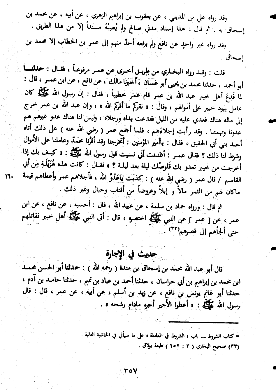 وقد رواه على بن المدينى عن يعقوب بن ابراهيم الزهرى عن ابيه عن محمد بن اسحاق به ثم قال هذا اسناد مدنى صالح ولم يصبه مسندا الا من هذا الطريق وقد رواه غير واحد عن نافع ولم يرفعه احد منهم الى عمر بن الخطاب الا محمد بن اسحاق قلت وقد رواه البخارى من طريق اخرى عن عمر مرفوعا فقال حدثنا ابو محمد حدثنا محمد بن يحيى ابو غسان أخبرنا مالك عن نافع عن ابن عمر قال لما دفع اهل خبير عبد الله بن عمر قام عمر خطيبا فقال ان رسول الله صلى الله عليه وسلم كان عامل يهود خبير على اموالهم وقال نقركم ما أقركم الله وان الله بن عمر خرج الى ماله هناك فعدى عليه من الليل ففدعت يداه ورجلاه وليس لنا هناك عدو غيرهم هم عدونا وتهمتنا وقد رأيت إجلاءهم فلما اجمع عمر رضى الله عنه على ذلك اتاه احد بنى ابى الحقيق فقال يا امير المؤمنين اتخرجنا ةقد اقرنا محمد وعاملنا على الاموال وشرط لنا ذلك فقال عمر أظننت انى نسيت قول رسول الله صلى الله عليه وسلم كيف بك اذا اخرجت من خبير تعدو بك قلوصك ليلة بعد ليلة فقال كانت هذه هزيلة نت ابى القاسم قال عمر رضى الله عنه كذبت يا عدو الله فأجلاهم عمر وأعطاهم قيمة ما كان لهم من الثمر مالا وابلا وعروضا من أقتاب وحبال وغير ذلك ثم قال ورواه حماد بن سلمة عن عبيد الله قال احسبه عن نافع عن ابن عمر عن عمر عن النبى صلى الله عليه وسلم اختصره قال اتى النبى صلى الله عليه وسلم اهل خبير فقاتلهم حتى ألجاهم الى قصرهم حديث فى الاجارة قال ابو عبد الله محمد بن اسحاق بن مندة رحمه الله حدثنا ابو الحسن محمد ابن محمد بن ابراهيم بن ابى حراسان حدثنا احمد بن عباد بن تميم حدثنا حامد بن آدم حدثنا ابو غانم يونس بن نافع عن زيد بن اسلم عن ابيه عن عمر قال قال رسول الله صلى الله عليه وسلم أعطوا الاجير أجره مادام رشحه