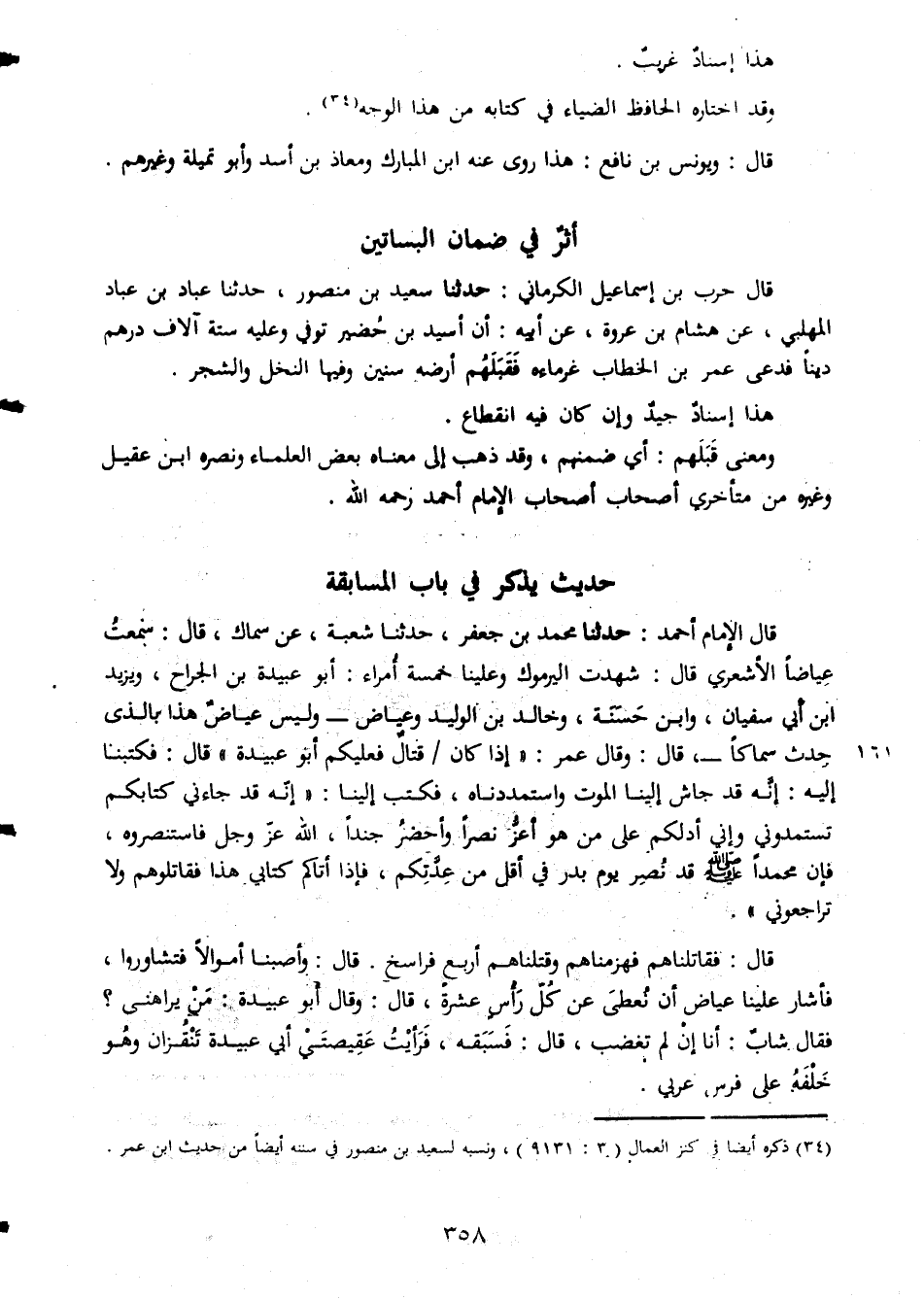 هذا اسناد غريب وقد اختاره الحافظ الضياء فى كتابه من هذا الوجه قال ويونس بن نافع هذا روى عنه ابن المبارك ومعاذ بن اسد وابو تميلة وغيرهم أثر فى ضمان البساتين قال حرب بن اسماعيل الكرمانى حدثنا سعيد بن منصور حدثنا عباد بن عباد المهلبى عن هشام بن عروة عن ابيه ان اسيد بن حضير توفى وعليه ستة آلاف درهم دينا فدعى عمر بن الخطاب غرماءه فقبلهم ارصة سنين وفيها النخل والشجر هذا اسناد جيد وان كان فيه انقطاع ومعنى قبلهم اى ضمنهم وقد ذهب الى معناه بعض العلماء ونصرة ابن عقيل وغيره من متأخرى أصحاب أصحاب الامام أحمد رحمه الله حديث يذكر فى باب المسابقة قال المام احمد حدثنا محمد بن جعفر حدثنا شعبة عن سماك قال سمعت عياضا الاشعرى قال شهدت اليرموك وعلينا خمسة امراء ابو عبيدة بن الجراح ويزيد ابن ابى سفيان وابن حسنة وخالد بن الوليد وعياض هذا بالذى حدث سماكا قال وقال عمر اذا كان قتال فعليكم ابو عبيدة قال فكتبنا اليه انه قد جاش الينا الموت واستمددناه فكتب الينا انهقد جاءنى كتابكم تستمدونى وانى ادلكم على من هو اعز نصرا واحضر جندا الله عز وجل فاستنصروه فإن محمد صلى الله عليه وسلم قد نصر يوم بدر فى اقل من عدتكم فإذا اتاكم كتابى هذا فقاتلوهم ولا تراجعونى قال فقاتلناهم فهزمناهم وقتلناهم اربع فراسخ قال وأصبنا اموالا فتشاوروا فأشار علينا عياض ان نعطى عن كل رأس عشرة قال وقال ابو عبيدة من يراهنى فقال شاب انا ان لم تغضب قال فسبقه فرأيت عقيصتى ابى عبيدة تنقزان وهو خلفه على فرس عربى