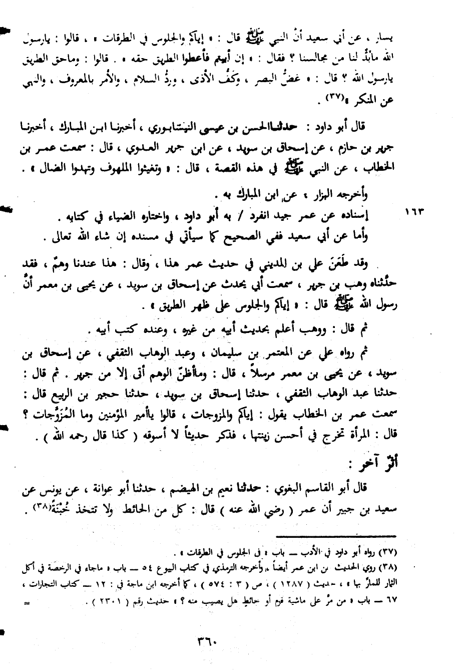 يسار عن أبي سعيد أن النبي صلى الله عليه وسلم قال إياكم والجلوس في الطرقات قالوا يا رسول الله ما بد لنا من مجالسنا فقال ان ابيتم فاعطوا الطريق حقه قالوا وما حق الطريق يا رسول الله قال غض البصر وكف الاذى ورد السلام والامر بالمعروف والنهى عن المنكرقال ابو داود حدثناالحسن بن عيسى النيتابورى أخبرنا ابن المبارك أخبنا جرير بنحازم عن اسحاق بن سويد عن ابن جرير العلوى قال سمعت عمر بن الخطاب عن النبى صلى اللله عليه وسلم فى هذه القصة قال وتغيثوااللهوف وتهدوا الضال وأخرجهالبزار عن ابن البارك به اسناد عن عمر جيدانقر به ابو داود واختاره الضياء فى كتابه وأما عن ابى سعيد فقى الصحيح كما سيأتى فى مسنده ان شاء الله تعالى وقد طعن على بن الدينى فى حديث عمرهذا وقال هذا عندنا وهم فقد حدثنا وهب بن جرير سمعت أبى يحدث عن اسحاق بن سويد عن يحيىبن معمر أن رسول الله صلى اللله عليه وسلم قال اياكم والجلوس على ظهر الطريق ثم قال ووهب اعلم بحديث أبيه من غيرهوعنده كتب أبيه ثم رواه على المعتمربن سليمان وعبد الوهاب الثقفى عن اسحاق بن سويد عن اسحاق بن سويد عن يحيى بن معمر مرسلا قال ومااظن الوهم أتى الا من جريرثم قال حدثنا عبد الوهاب التقفي حدثنا إسحاق بن سويد حدثنا حجير بن الربيع قال سمعت عمر بن الخطاب يقول إياكم المزوجات قالوا يا أمير المؤمنين وما المزوجات قال المرأة تخرج فى أحسن زينتها فذكر حديثاً لا أسوقه كذا قال رحمة الله أثر أخر قال أبو القاسم البغوى حدثنا نعيم بن الهيضم حدثنا ابو عوانة عن يونس عن سعيد بن جبي ان عمر رضى الله عنه قال كل من الحائط ولا تتخذ حبنة