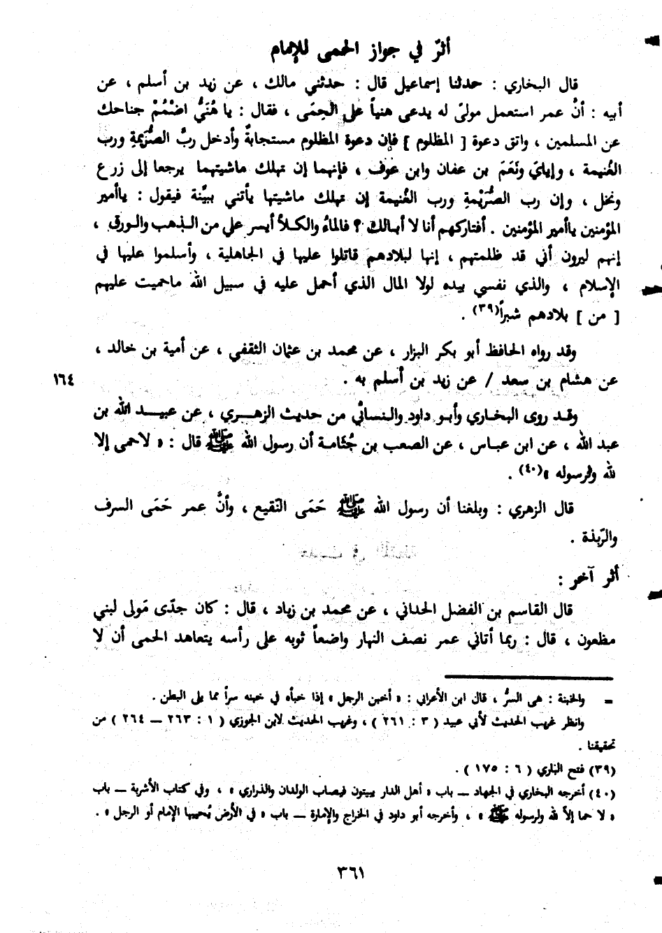 أثر فى جواز الحمى للإمام قال البخارى حدثنا اسماعيل قال حدثنى مالك عن زيد بن اسلم عن ابيه ان عمر استعمل مولى له يدعى هنيا على الحمى فقال يا هنى اضمم جناحك عن المسلمين واتق دعوة المظلوم فإن دعوة المظلوم مستجابة وأخل رب الصريمة ورب الغنيمة واياى ونعم بن عفان وابن عون فإنهما ان تلك ما شيتها يرجعا الى زرع ونخل وان رب الصريمة ورب الغنيمة ان تلك ما شيتها يأتنى بيبه فيقول يا أمير المؤمنين أفتاركهم انا لا ابالك فالماء والكلأ ايسر على من الذهب والورق انهم ليرون انى قد ظلمتهم انها لبلادهم قاتلوا عليها فى الجاهلية وأسلموا عليها فى الاسلام والذى نفسى بيده لولا المال الذى أحمل عليه فى سبيل الله ما حميت عليهم من بلادهم شبرا وقد رواه الحافظ ابو بكر البزار عن محمد بن عثمان الثقفى عن امية بن خالد عن هشام بن سعد عن زيد بن أسلم به وقد روى البخارى وابو داود والنسائى من حديث الزهرى عن عبيد الله بن عبد الله عن ابن عباس عن الصعب بن جثامة ان رسول الله صلى الله عليه وسلم قال لا حمى الا لله ولرسوله قال الزهرى وبلغنا ان رسول الله صلى الله عليه وسلم حمى النقيع وان عمر حمى السرف والربذة اثر آخر قال القاسم بن الفضل الحدانى عن محمد بن زياد قال كان جدى مولى لبنى مظعون قال ربما اتانى عمر نصف النهار واضعا ثوبة على راسه يتعاهد الحمى ان لا
