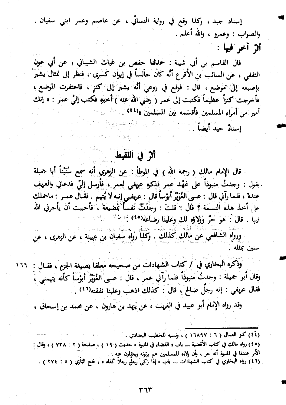 إسناد جيد وكذا وقع في رواية النسائى عن عاصم وعمر ابنى سفيان والصواب وعمرو والله اعلم أثر آخر فيها قال القاسم بن ابى شيبة حدثنا حفص بن غياث الشيبانى عن ابى عون الثقفى عن السائب بن الاقرع أنه كان جالسا فى ايوان كسرى فنظر الى تمثال يشير بإصبعه الى الموضع قال فوقع فى روعى أنه يشير الى كنز فإحتفرت الموضع فأخرجت كنزا عظيما فكتبت الى عمر رضى الله عنه أخبره فكتب الى عمر انك أمير من أمراء المسلمين فأقسمه بين المسلمين اسناد جيد ايضا أثر فى اللقيط قال الامام مالك رحمه الله فى الموطأ عن الزهرى أنه سمع سنينا ابا جميلة يقول وجدت منبوذا على عهد عمر فذكره عريفى لعمر فأرسل الى فدعانى والعريف عنده فلما رآنى قال عسى الغوير أبوسا قال عريفى إنه لا يتهم فقال عمر ما حملك على آخذ هذه النسمة قال قلت وجدت نفسا بمضيعة فأحببت ان يأجرنى الله فيها قال هو حر وولاؤه لك وعلينا رضاعة ورواه الشافعى عن مالك كذلك وكذا رواه سفيان بن عيينة عن الزهرىعن سنين بمثله وذكره البخارى فى كتاب الشهادات من صحيحه معلقا بصيغة الجزم فقال وقال ابو جميلة وجدت منبوذا فلما رآنى عمر قال عيسى الغوير ابؤسا كأنه يتهمنى فقال عريفى انه رجل صالح قال كذلك اذهب وعلينا نفقته وقد رواه الامام ابو عبيد فى الغريب عن يزيد بن هارون عن محمد بن اسحاق