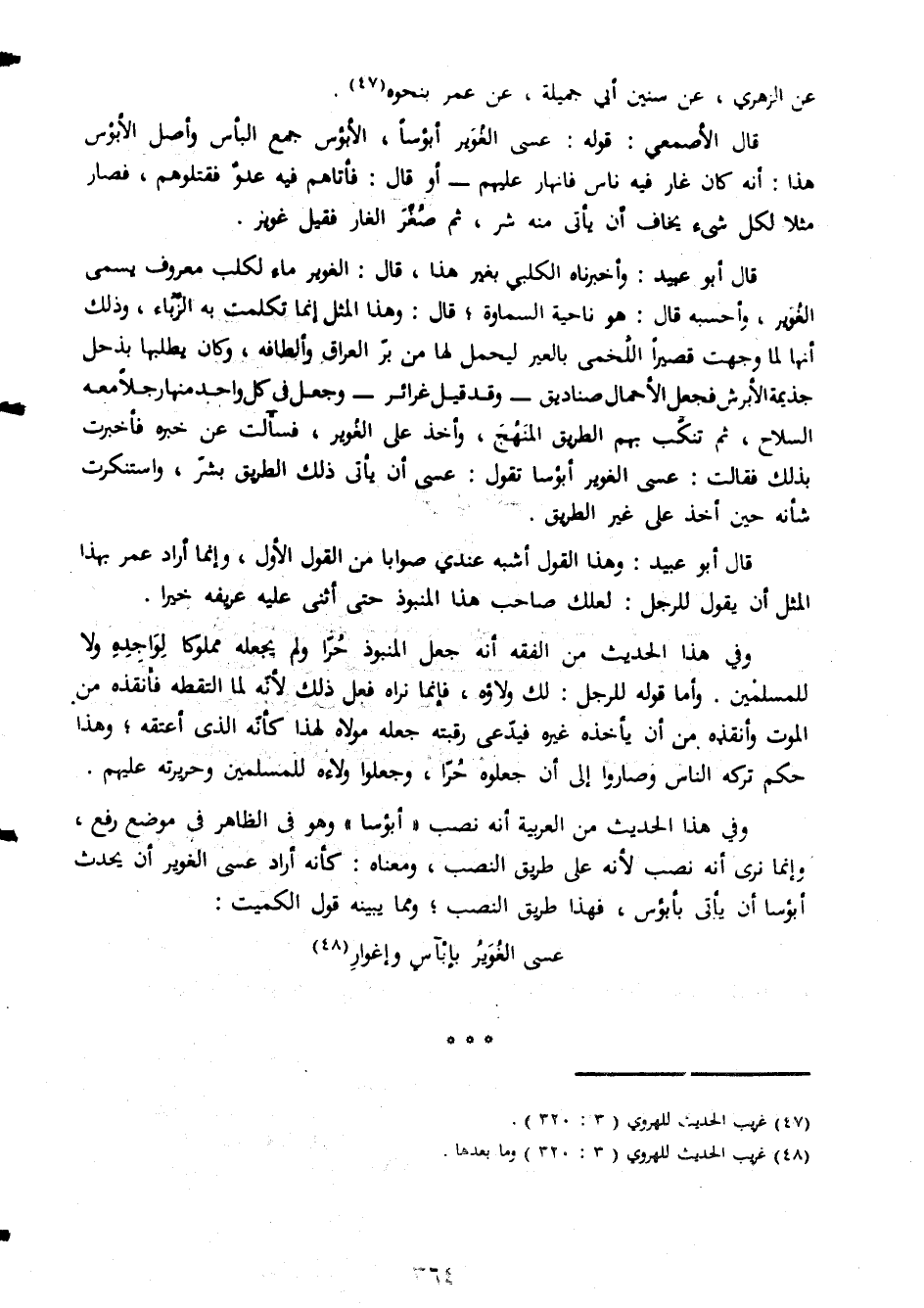 عن الزهرى عن سنين ابى جميلة عن عمر بنحوه قال الاصمعى قوله عسى الغوير أبؤسا الابؤسجمع البأس وأصل الابؤس هذا أنه كان غار فيه ناس فانهار عليهم او قال فأتاهم فيه عدو فقتلوهم فصار مثلا لكل شىء يخاف ان يأتى منه شر ثم صغر الغار فقيل غوير قال ابو عبيد وأخبرناه الكلبى بغير هذا قال الغوير ماء الكلب معروف يسمى الغوير وأحسبه قال هو ناحية السماوة قال وهذا المثل انما تكلمت به الزباء وذلك انها لما وجهت قصيرا للحمى بالغير لها من بر العراق والطاقة وكان يطلبها بدخل جذيمة الابرش فجعل الاحمال صناديق وقد قبل غرائر وجعل فى كل واحد منها رجلا معه السلاح ثم تنكب بهم الطريق المنهج واخذ على الغوير فسألت عن خيره فأخبرت بذلك فقالت عسى الغوير ابؤسا تقول عسى ان يأتى ذلك الطريق بشر واستكرت شأنه حين أخذ على غير الطريق قال ابو عبيد وهذا القول أشبه عندى صوابا من القول الاول وانما اراد عمر بهذا المثل ان يقول للرجل لعلك صاحب هذا المنبوذ حتى أثنى عليه عريفه خيراًوفي هذا الحديث من الفقه انه ذ حرا ولم يجعله مملوكا لواجده ولا للمسلمين وأما قوله للرجل لك ولاؤه فإنما نراه فعل ذلك لانه لما التقطه فأنقذه من الموت وانقذه من ان يأخذه غير فيدعى رقبته جعله مولاه هذا كأنه الذى اعتقه وهذا حكم تركه االناس وصاروا الى ان جعلوه جرا وجعلوا ولاءه للمسلمين وحريرته عليهم وفى هذا الحديث من العربية انه نصب ابؤسا وهو فى الظاهر فى موضع رفع وانما نرى انه نصب لأنه على طريق النصب ومعناه كأنه اراد عسى الغوي ران يحدثابؤسا ان يأتى بأبؤس فهذا الطريق النصب ومما يبينه قول الكميت عسى الغوير بإباس واغوار