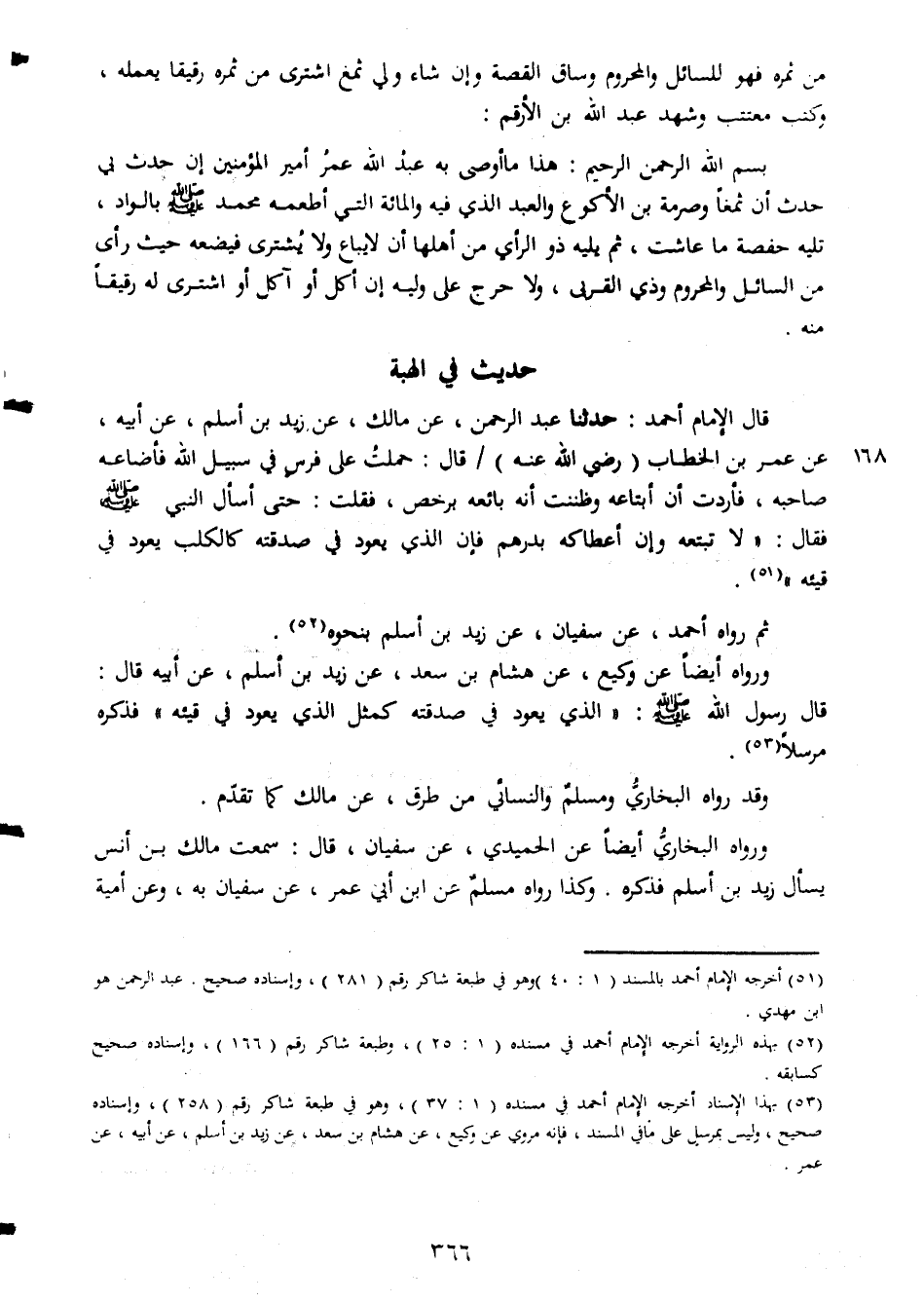 من ثمرة فهو للسائل والمحروم وساق القصة وان شاء ولى ثمن اشترى من ثمرة رقيقا يعمله وكتب معتتب وشهد عبد الله بن الارقم بسم الله الرحمن الرحيم هذا ما اوصى بع عبد الله عمر امير المؤمنين ان حدث بى حدث ان ثمغا وصرمة بن الاكوع والعبد الذى فيه والمائة التى أطعمه محمد صلى الله عليه وسلم بالواد تليه حفصة ما عاشت ثم يليه ذو الراى من أهلها ان لا يباع ولا يشترى فيضعه حيث راى من السائل والمحروم وذى القربى ولا حرج على وليه ان اكل او اكل او اشترى له رقيقا منه حديث فى الهبة قال الامام احمد حدثنا عبد الرحمن عن مالك عن زيد بن اسلم عن ابيه عن عمر رضى الله عنه قال حملت على فرس فى سبيل الله فأضاعه صاحبه فأردت ان ابتاعه وظننت انه بائعه برخص فقلت حتى اسال النبى صلى الله عليه وسلم فقال لا تبتعه وان اعطاكه بدرهم فإن الذى يعود فى صدقته كالكلب يعود فى قيئة ثم رواه احمد عن سفيان عن زيد بن اسلم بنحوه ورواه ايضا عن وكيع عن هشام بن سعد عن زيد بن اسلم عن ابيه قال قال رسول الله الذى يعود فى صدقته كمثل الذى يعود فى قيئه فذكره مرسلا وقد رواه البخارى ومسلم والنسائى من طرق عن مالك كما تقدم ورواه البخارى ايضا عن الحميدى عن سفيان قال سمعت مالك بن انس يسأل زيد اسلم فذكره وكذا رواه مسلم عن ابى عمر عن سفيان به وعن امية