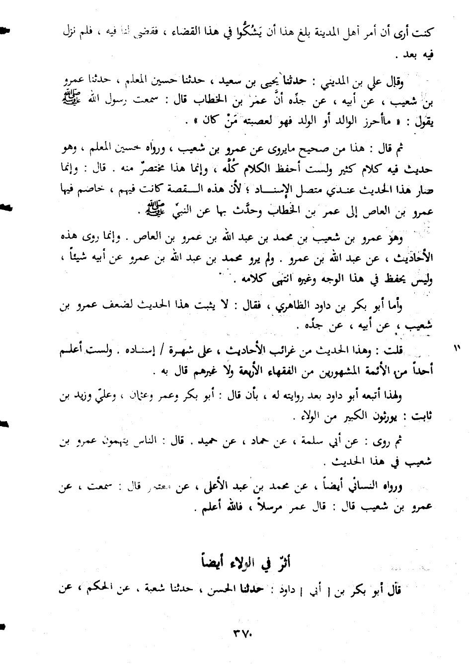كنت ارى ان امر اهل المدينة بلغ هذا ان يشكوا فى هذا القضاء فقضى فقضى لنا فيه فلم نزل فيه بعد وقال على بن المدينى حدثنا يحيى بن سعيد حدثنا حسين المعلم حدثنا عمرو بن شعيب عن ابيه عن جده ان عمر بن الخطاب قال سمعت رسول الله صلى الله عليه وسلم يقول ما احرز الوالد او الولد فهو لعصبته من كان ثم قال هذا من صحيح ما يروى عن عمرو بن شعيب ورواه حسين المعلم وهو حديث فيه كلام كثير ولست احفظ الكلام كله وانما هذا مختصر منه قال وانما صار هذا الحديث عندى متصل الاسناد لأن هذه القصة كانت فيهم خاصم فيها عمرو بن العاص الى عمر بن الخطاب وحدث بها عن النبى صلى الله عليه وسلم وهو عمرو بن شعيب بن محمد بن عبد الله بن عمرو بن العاص وانما روى هذه الاحاديث عن عبد الله بن عمرو ولم يرو محمد بن عبد الله بن عمرو عن أبيه شيئاً وليس يحفظ فى هذا الوجه وغيره انتهى كلامه واما ابو بكر بن داود الظاهري فقال لا يثبت هذا الحديث من غرائب الأحاديث على شهرة اسناده ولست اعلم احدا من الائمة المشهورين من الفقهاء الاربعة ولا غيرهم قال به ولهذا اتبعه ابو داود بعد روايته له بان قال ابو بكر وعمر وعثمان وعلي وزيد بن ثابت يورثون الكبير من الولاء ثم روى عن ابي سلمة عن حماد عن حميد قال الناس يتهمون عمرو بن شعيب فى هذا الحديث ورواه النسائى ايضا عن محمد بن عبد الاعلىعن معتمر قالسمعت عن عمرو بن شعيب قال قال عمر مرسلا فالله اعلم اثر فى الولاء ايضا قال ابو بكر بن ابي داود حدثنا الحسن حدثنا شعبة عن الحكم عن