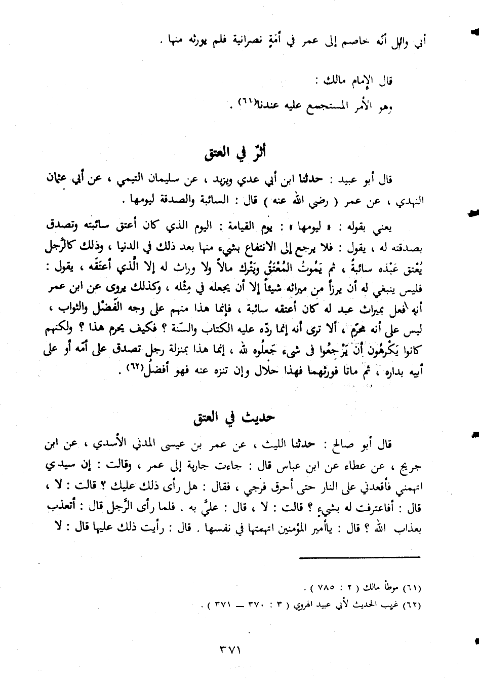 ابي وائل انه خاصم الى عمر في امة نصرانية فلم يورثه منها قال الامام مالك وهو الامرالمستجمع علي عندنا اثر فى العتق قال ابو عبيد حدثنا ابن ابي عدي ويزيدعن سليمان التيمي عن ابي عثمان النهدى عن عمر رضى الله عنه قال السائبة والصدقة ليومها يعنى بقوله ليومها يوم القيامة اليو م الذى كان اعتق سائبته وتصدق بصدقته له يقول فلا يرجع الى النتفاع بشيء منها بعدذلك كالرجل يعتق عبده سائبة ثم يموت المعتق ويترك مالا ولا وارث له الا ان يجعله في مثله وكذلك يروى عن ابن عمر انه فعل بميراثهعبد له كان اعتقه سائبة فانما هذا منهم على وجه الفضل والثواب ليس على انه محرم الا ترى انه انما رده عليه الكتاب والسنة فكيف يحرم هذا ولكنهم كانو يكرهون ان يرجعوا فى شئ جعلوه لله انما هذا بمنزلة رجل تصدق على امه او على ابيه بداره ثم ماتا فورثهما فهذا حلال وان تنزه عنه فهو افضل حديث فى العتق قال ابو صالح حدثنا الليث عن عمر بن عيسى المدني الاسدي عن ابن جريح عن عطاء عن ابن عباس قال جاءت جارية الى عمر وقالت لا قال افا عترفت لهبشئ قالت لا قال علي به فلما راىالرجل قال اتعذب بعذاب الله قال يا امير المؤمنين اتهمتها فى نفسها قال رايت ذلك عليها قال لا