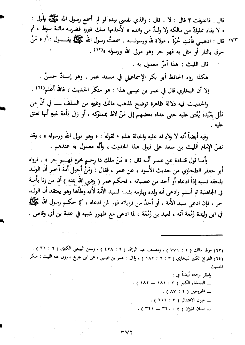 قال فاعترفت قال لا قال والذى نفسى بيده لو لم اسمع رسول الله صلى الله عليه وسلم يقول لا يقاد مملوك من مالكه ولد من والده لأخذتها منك فبرزه فضربه مائة سوط ثم قال اذهبى فأنت حرة مولاة لله ورسوله سمعت رسول الله صلى الله عليه وسلم يقول من حرق بالنار او مثل به فهو حر وهو مولى الله ورسوله قال الليث هذا أمر معمول به هكذا رواه الحافظ ابو بكر الاسماعيلى فى مسند عمر وهو اسناد حسن الا ان البخارى قال عمر بن عيسى هذا هو منكر الحديث فالله أعلم والحديث فيه دلالة ظاهرة توضح لمذهب مالك وغيره من السلف فى ان من مثل بعبده يعتق عليه حتى عداه بعضهم الى من لاط بملوكه اوزنى بأمه غيره انها تعتق عليه وفيه ايضا انه لا ولاء له عليه والحالة هذه لقوله وهو مولى الله ورسوله وقد نص الامام الليث بن سعد على قبول هذا الحديث وانه معمول به عندهم واما قول قتادة عن عمر انه قال من ملك دارحم محرم فهو حر فرواه ابو جعفر الطحاوى من حديث الاسود عن عمر فقال ومن أجل أمة آخر ان الولد يلحقه نسبة اذا ادعاه او احد من عصباته فحكم عمر رضى الله عنه ان من زنا بأمه فى الجاهلية ثم اسلم وادعى انه ولده ويلزمه بثمنه لسيد الامة الانه وطأها وهو يعتقد ان الولد حر فإن ادعى سيد الامة او احد من قراباته فهو لمن ادعاه كما حكم رسول الله صلى الله عليه وسلم فى ابن وليدة زمعة انه لعبد بن زمعة لما ادعى مع ظهور شبهه فى عتبة بن ابى وقاص
