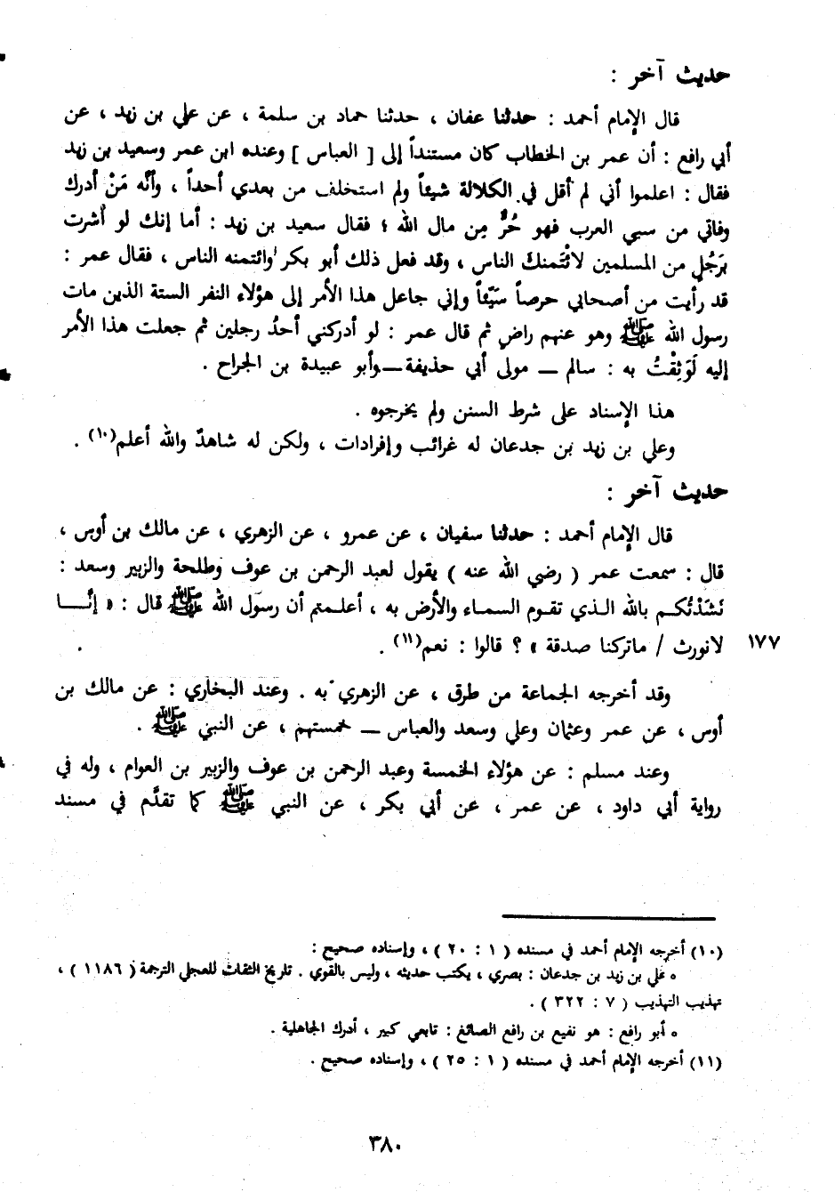حديث اخر قال الامام احمد حدثنا عفان حدثنا حماد بن سلمة عن على بن زيد عن ابى رافع ان عمر بن الخطاب كان مستندا الى العباس وعنده ابن عمر وسعيد بن زيد فقال اعلموا انى لم اقل فى الكلالة شيئا ولم استخلف من بعدى احدا وانه من ادرك وفاتى من سبى العرب فهو حر من مال الله فقال سعيد بن زيد اما انك لو اشرت برجل من المسلمين لا تتمنك الناس وقد فعل ذلك ابو بكر وائتمنه الناس فقال عمر قد رأيت من أصحابى حرصا سيئا وانى جاعل هذا الامر الى هؤلاء النفر الستة الذين مات رسول الله صلى الله عليه وسلم وهو عنهم راض ثم قال عمر لو ادركنى احد رجلين ثم جعلت هذا الامر اليه لو ثقت به سالم مولى ابى حذيفة وابو عبيدة بن الجراح هذا الاسناد على شرط السنن ولم يخرجوه وعلي بن زيد بن جدعان له غرائب وافرادات ولكن له شاهد والله اعلم حديث اخر قال الامام احمد حدثنا سفيان عن عمرو عن الزهري عن مالك بن اوس قال سمعت عمر رضي الله عنه يقول لعبد الرحمن بن عوف وطلحة والزبير وسعد نشدتكم بالله الذى تقوم السماء والارض به اعلمتم ان رسول الله صلى الله عليه وسلم قال انالا نورث ماتركنا صدقة قالوا نعم وقد اخرجه الجماعة من طرق عن الزهري به وعند البخارى عن مالك بن اوس عن عمر وعثمان وعلي وسعد والعباس خمستهم عن النبي صلى الله عليه وسلم وعند مسلم عن هؤلاء الخمسة وعبد الرحمن بن عوف والزبير بن العوام وله في رواية ابي داود عن عمر عن ابي بكر عن النبي صلى الله عليه وسلم كما تقدم في مسند