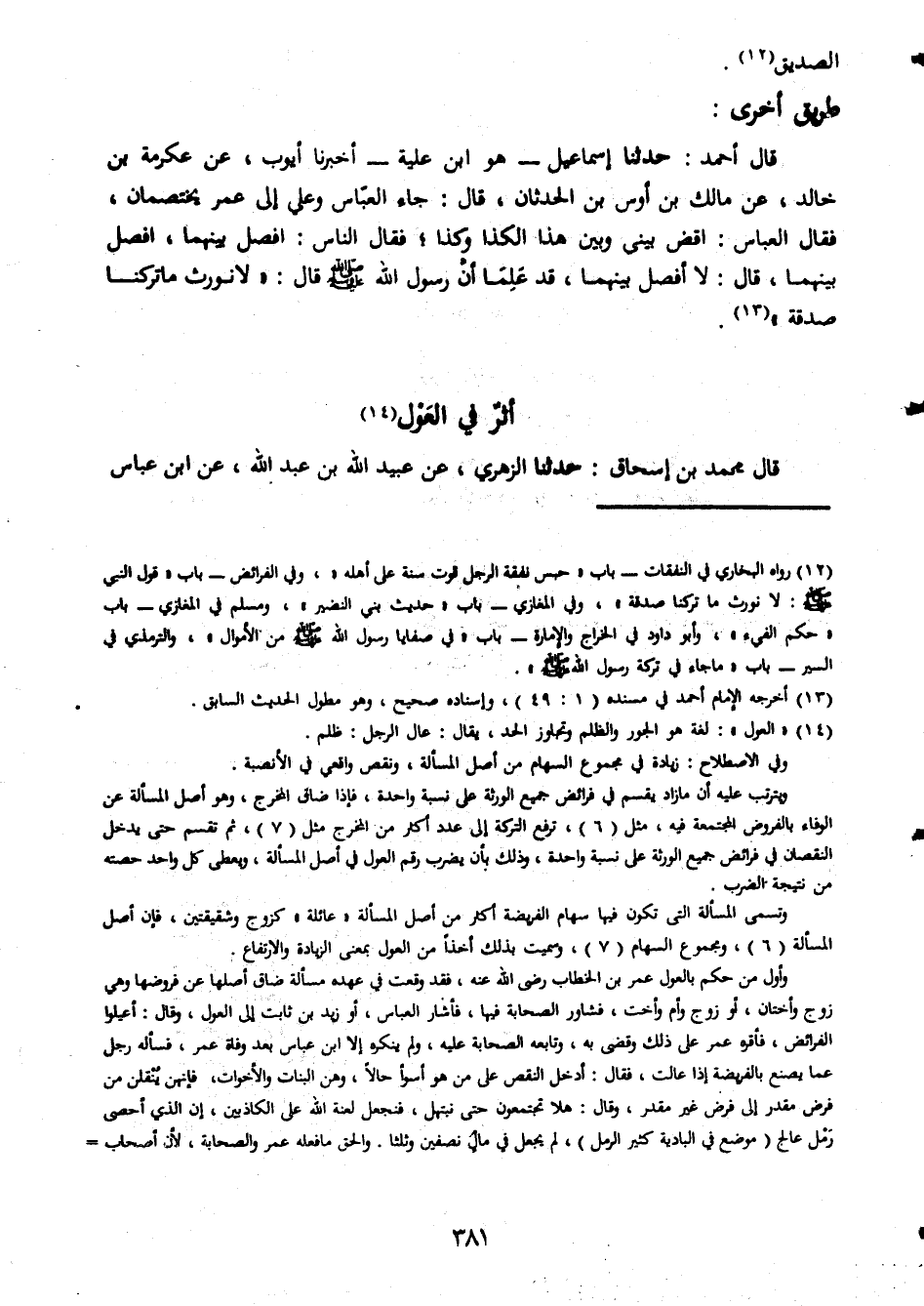 الصديق طريق اخر قال احمد حدثنا اسماعيل هو ابن علية اخبرنا ايوب عن عكرمة بن خالد عن مالك بن اوس بن الحدثان قال جاء عباس وعلي الى عمر يختصمان فقال العباس اقض بيتي وبين هذا الكذا وكذا فقال الناس افصل بينهما قال لا افصل بينهما قد علما ان رسول الله صلى الله عليه وسلم قال لانورث ما تركنا صدقة اثر فى الول قال محمد بن اسحاق حدثنا الزهري عن عبيد الله بن عبد الله عن ابن عباس