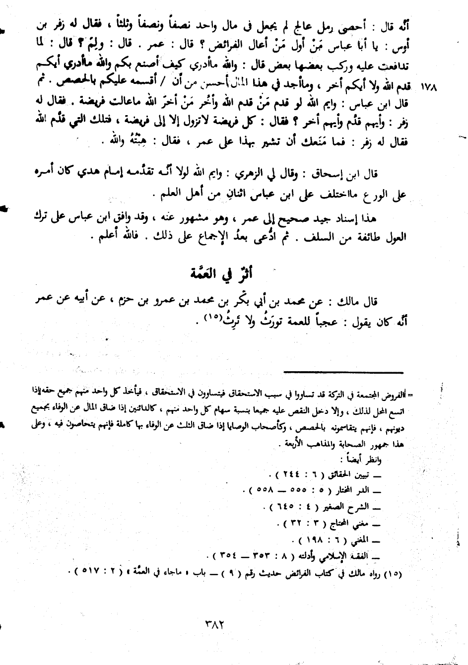 انه قال احصى رمل عالج لم يجعل فى مال واحد نصفا وثلثا فقال له زافر بن اوس يا ابا عباس من اول من اعال الفرائض قال عمر قال ولم قال لما تدافعت عليه وركب بعضها بعض قال والله ما ادرى كيف اصنع بكم والله ما ادرى ايكم قدم الله ولا ابك ماخر وما اجد فى هذا المال احسن من ان اقسمه عليكم بالحصص ثم قال ابن عباس وايم الله لو قدم من قدم الله واخر من اخر الله ما عالت فريضة فقال له زفر وايهم قدم وايهم أخر فقال كل فريضة لا تزول فتلك التى قدم الله فقال له زافر فما منعك ان تشير بهذا على عمر فقال هبته والله قال ابن اسحاق وقال لى الزهرى وايم الله لولا انه تقده امام هدى كان امره على الورع ما اختلف على ابن عباس اثنان من اهل العلم هذا اسناد جيد صحيح الى عمر وهو مشهور عنه وقد وافق ابن عباس على ترك العول طائفة من السلف ثم ادعى بعد الاجماع على ذلك فالله اعلم أثر فى العمة قال مالك عن محمد بن ابى بكر بن محمد بن عمرو بن حزم عن ابيه عن عمر انه قال كان يقول عجبا للعمة تورث ولا ترث