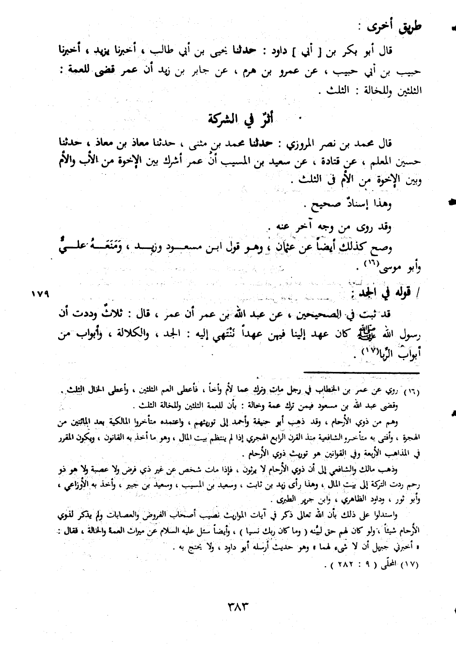 طريق اخرى قال ابو بكر بن ابى داود حدثنا يحيى بن ابى طالب اخبرنا يزيد اخبرنا حبيب بن ابى حبيب عن عمرو بن هرم عن جابر بن زيد قضى للعمة الثلثين وللخالة الثلث أثر فى الشركة قال محمد بن نصر المروزى حدثنا محمد بن مثنى حدثنا معاذ بن معاذ حدثنا حسين المعلم عن قتادة عن سعيد بن المسي بان عمر اشرك بين الاخوة من الاب والام وبين الاخوة من الام فى الثلث وهذا اسناد صحيح وقد روى من وجه آخر عنه وصح كذلك ايضا عن عثمان وهو قول ابن مسعود وزيد ومنعه على وابو موسى قوله فى الجد قد ثبت فى الصحيحين عن عبد الله بن عمر ان عمر قال ثلاث وددت ان رسول الله صلى الله عليه وسلم كان عهد الينا فيهن عهدا ننتهى اليه الجد والكلالة وابواب من ابواب الربا