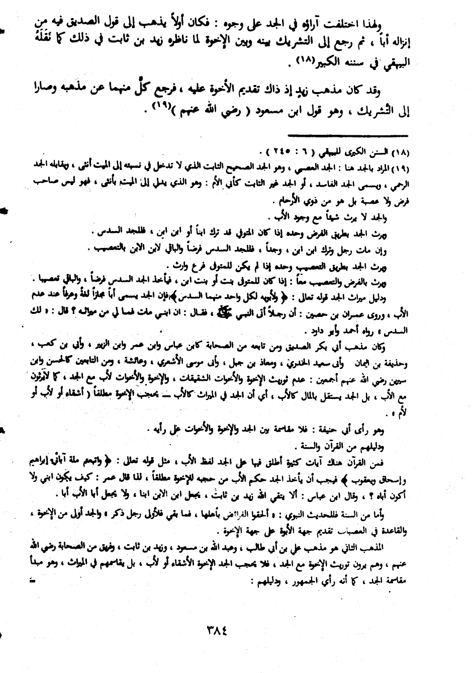 ولهذا اختلف اراؤه فى الجد على وجوه فكان اولا يذهب الى قول الصديق فيه من انزاله ابا ثم رجع الى التشريك بينه وبين الاخوة لما ناظرة زيد بن ثابت فى ذلك كما نقله البيقهى فى سننه الكبير وقد كان مذهب زيد اذا ذاك تقديم الاخوة عليه فرجع كل منهما عن مذهبه وصارا الى التشريك وهو قول ابن مسعود رضى الله عنهم