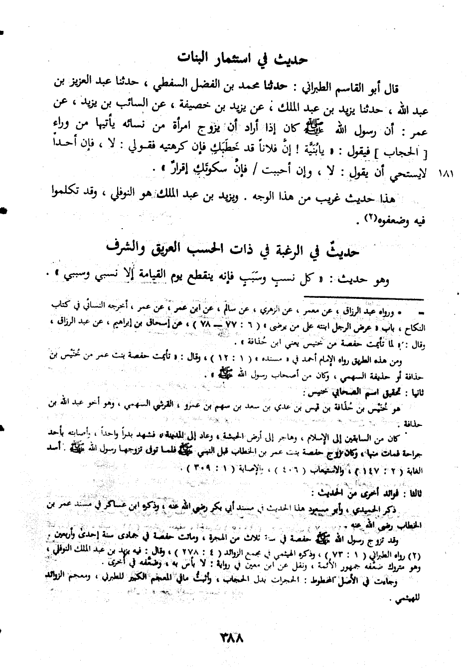 حديث فى استثمارالبنات قال ابو القاسم الطبرانى حدثنا محمد بن الفضل السفطى حدثنا عبد العزيز بن عبد الله حدثنا يزيد بن عبد الملك عن يزيد بن خصيفة عن السائب بن يزيد عن عمر ان رسول الله صلى الله عليه وسلم كان اذا اراد ان يزوج امراة من نسائه يأتيها من وراء الحجاب فيقول يابنته ان فلانا قد خطبك فإن كرهتيه فقولى لا فإن احدا لا يستحى ان يقول لا وان احببت فإن سكوتك اقرار هذا حديث غريب من هذا الوجه ويزيد بن عبد الملك هو النوفلى وقد تكلموا فيه وضعفوه حديث فى الرغبة فى ذات الحسب العريق والشرف وهو حديث كل نسب وسبب فإنه ينقطع يوم القيامة الا نسبى وسببى