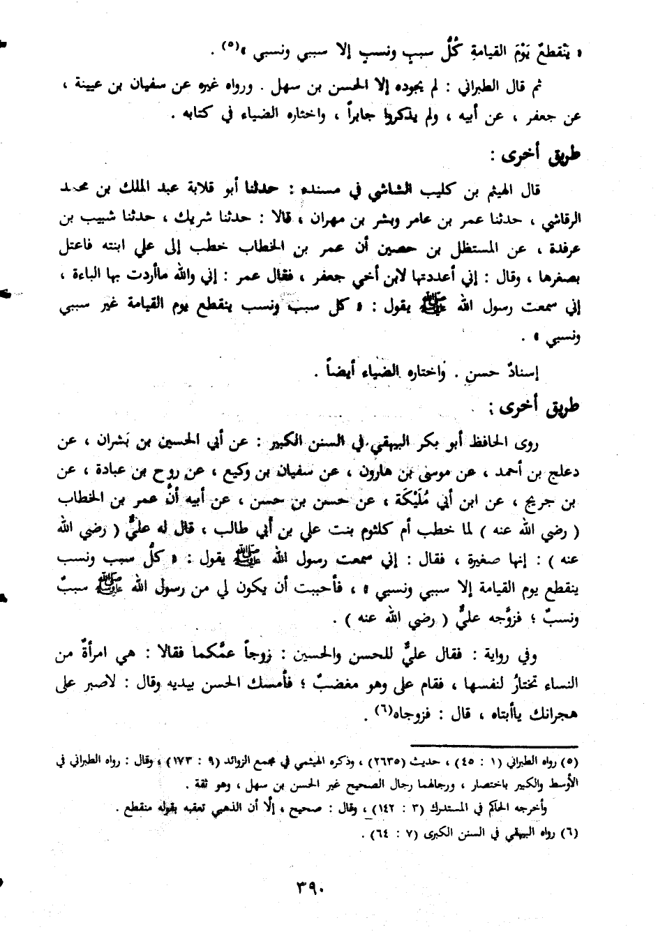 ينقطع يوم القيامة كل سبب ونسب الا سببى ونسبى ثم قال الطبرانى لم يجوده الا الحسن بن سهل ورواه غيره عن سفيان بن عيينة عن جعفر عن ابيه ولم يذكروا جابرا واختاره الضياء فى كتابه طريق اخرى قال الهيثم بن كليب الشاشى فى مسنده حدثنا ابو قلابة عبد الملك بن محمد الرقاشى حدثنا عمر بن عامر وبشر بن مهران قالا حدثنا شريك حدثنا شبيب بن عرفدة عن المستظل بن حصين ان عمر بن الخطاب خطب الى على ابنته فاعتل بصغرها وقال انى اعددتها لأبن اخى جعفر فقال عمر انى والله ما اردت بها الباءة انى سمعت رسول الله صلى الله عليه وسلم يقول كل سبب ونسب ينقطع يوم القيامة غير سببى ونسبى اسناد حسن واختاره الضياء ايضا طريق اخرى روى الحافظ ابو بكر البيهقى فى السنن الكبير عن ابى الحسين بن بشران عن دعلج بن احمد عن موسى بن هارون عن سفيان بن وكيع عن روح بن عبادة عن بن جريج عن ابن ابى مليكة عن حسن بن حسن عن ابيه ان عمر بن الخطاب رضى الله عنه لما خطب ام كلثوم بنت على بن ابى طالب قال له على رضى الله عنه انها صغيرة فقال انى سمعت رسول الله صلى الله عليه وسلم يقول كل سبب ونسب ينقطع يوم القيامة الا سببى ونسبى فأحببت ان يكون لى من رسول الله صلى الله عليه وسلم سبب ونسب فزوجه على رضى الله عنه وفى روايه فقال على للحسن والحسين زوجا عمكما فقالا هى امراة من النساء تختار لنفسها فقام على وهو مغضب فأمسك الحسن بيديه لا صبر على هجرانك يا ابتاه قال فزوجاه