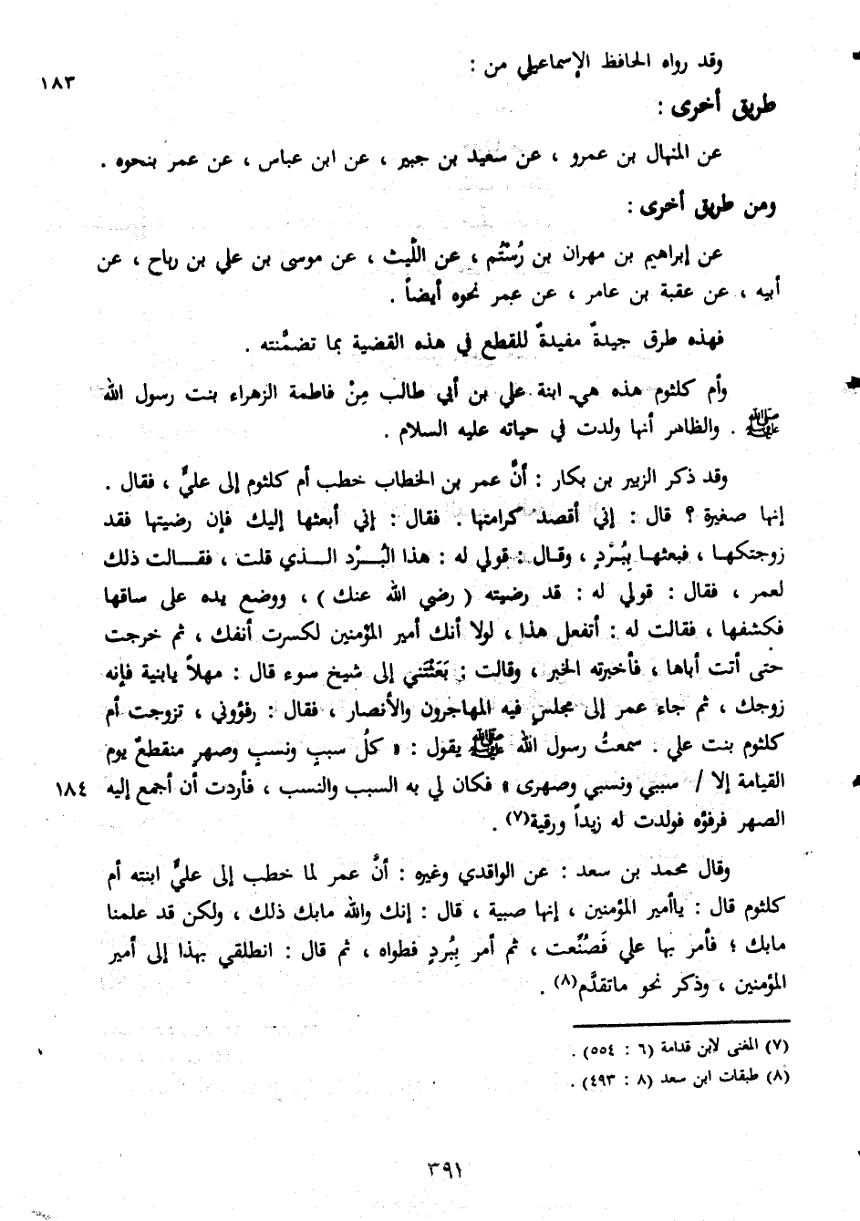 وقد رواه الحافظ الاسماعيلى من طريق اخرى عن المنهال بن عمرو عن سعيد بن جبير عن ابن عباس عن عمر بنحوه ومن طريق اخرى عن ابراهيم بن مهران بن رستم عن الليث عن موسى بن على بن رباح عن ابيه عن عقبة بن عامر عم عمر نحوه ايضا فهذه طرق جيدة مفيدة للقطع فى هذه القضية بما تضمنته وام كلثوم هذه هى ابنة على بن ابى طالب من فاطمة الزهراء بنت رسول الله صلى الله عليه وسلم والظاهر انها ولدت فى حياته عليه السلام وقد ذكر الزبير بن بكار ان عمر بن الخطاب خطب ام كلثوم الى على فقال انها صغيرة قال انى اقصد كرامتها فقال انى ابعثها اليك فإن رضيتها فقد زوجتكما فبعثها ببرد وقال قولى له هذا البرد الذى قلت فقالت ذلك لعمر فقال قولى له قد رضيته رضى الله عنك ووضع يده على ساقها فكشفها فقالت له أتفعل هذا لولا انك امير المؤمنين لكسرت أنفك ثم خرجت حتى اتت اباها فأخبرته الخبر وقالت بعثتنى الى شيخ سوء قال مهلا يابنية فإنه زوجك ثم جاء عمر الى مجلس فيه المهاجرون والانصار فقال رفؤونى تزوجت ام كلثوم بنت على سمعت رسول الله صلى الله عليه وسلم يقول كل سبب ونسب وصهر منقطع يوم الصهر فرفؤه فولدت له زيدا ورقية وقال محمد بن سعد عن الواقدى وغيره ان عمر لما خطب الى على ابنته ام كلثوم قال يا امير المؤمنين انها صبية قال انك والله مابك ذلك ولكن قد علمنا ما بك فأمر بها فصنعت ثم امر ببرد فطواه ثم قال انطلقى بهذا الى امير المؤمنين وذكر نحو ما تقدم