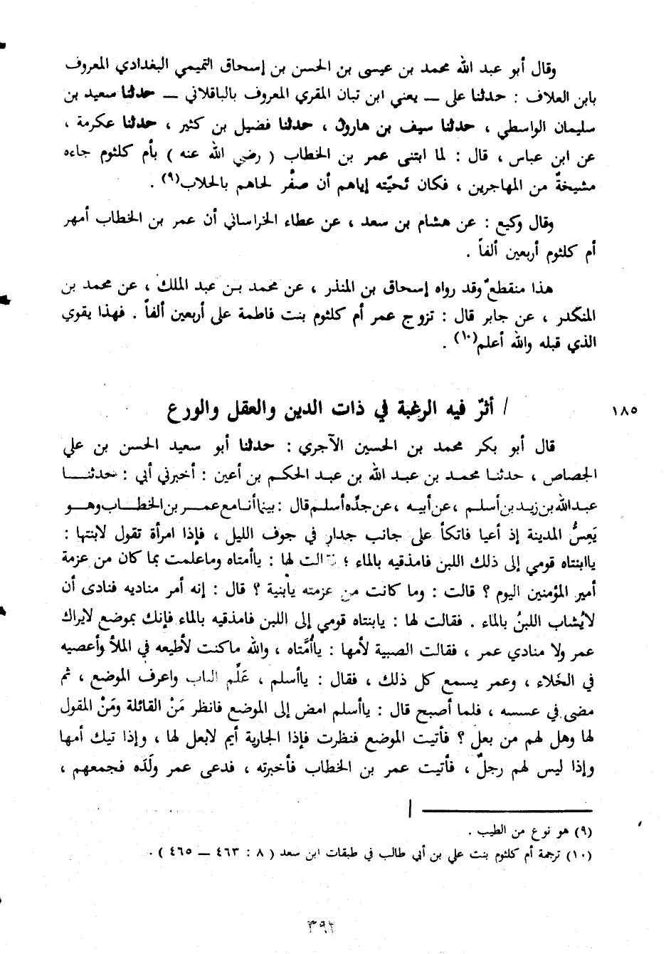 قال ابو عبد الله محمد بن عيسى بن الحسن بن اسحاق التميمى البغدادى المعروف بابن العلاف حدثنا على يعنى ابن تبان المقرى المعروف بالباقلانى حدثنا سعيد بن سليمان الواسطى حدثنا سيف بن هارون حدثنا فضيل بن كثير حدثنا عكرمة عن ابن عباس قال لما ابنتى عمر بن الخطاب رضى الله عنه بأم كلثوم جاءه مشيخة من المهاجرين فكان يحيتة اياهم ان صفر لحاهم بالحلاب وقال وكيع عن هشام بن سعد عن عطاء الخراسانى ان عمر بن الخطاب امهر ام كلثوم اربعين الفا هذا منقطع وقد رواه اسحاق بن المنذر عن محمد بن عبد الملك عن محمد بن المنكدر عن جابر قال تزوج عمر من ام كلثوم بنت فاطمة على اربعين الفا فهذا يقوى الذى قبله والله اعلم