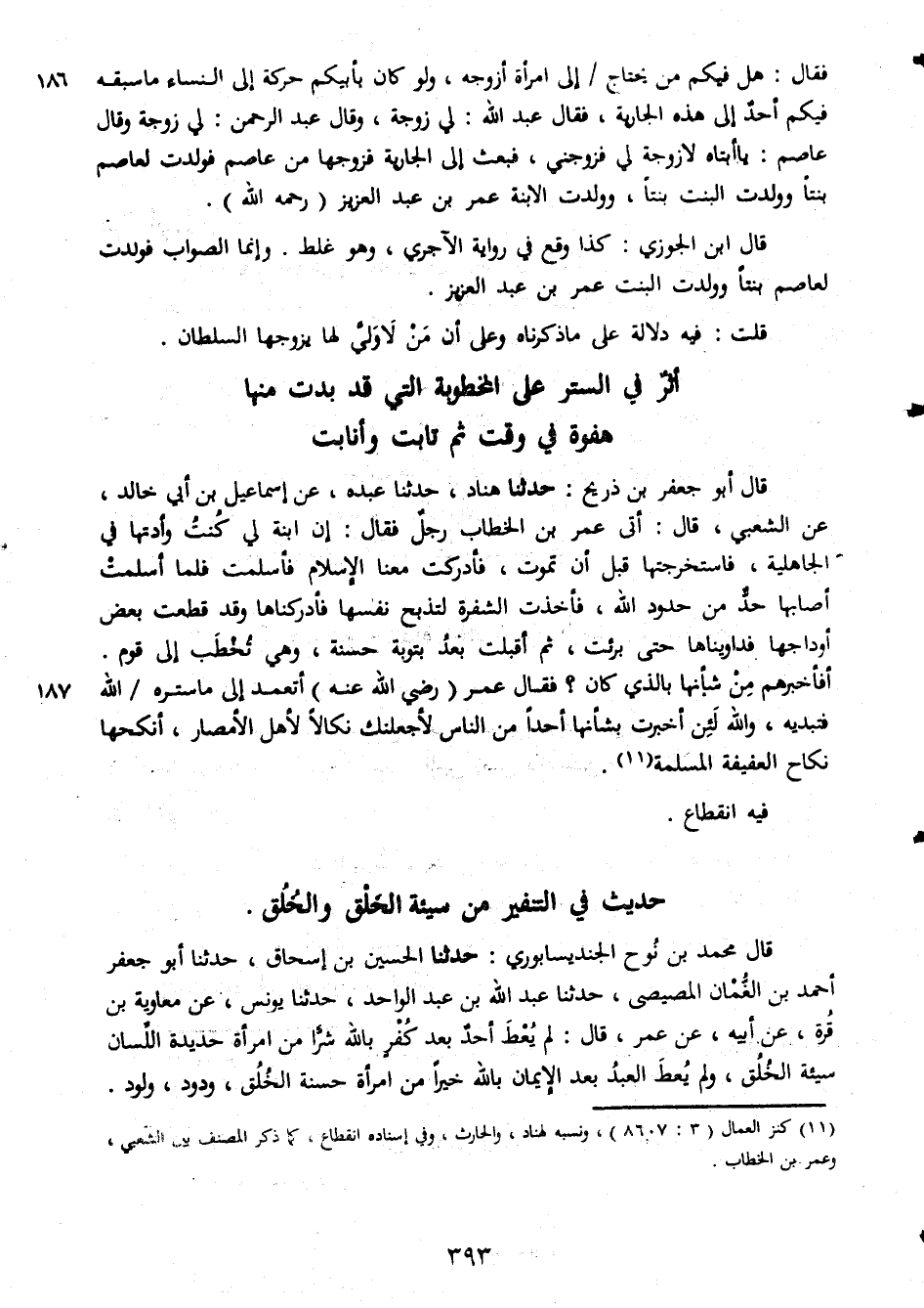 فقال هل فيكم من يحتاج الى امراة ازوجه ولو كان بابيكم حركة الى النساء ما سبقه فيكم احد الى هذه الجارية فقال عبد الله لى زوجة وقال عبد الرحمن لى زوجه وقال عاصم يا ابتاه لازوجه لى فزوجنى فبعث لى الجارية فزوجها منعاصم فولدت لعاصم بنتا وولدت البنت بنتا وولدت الابنة عمر بن عبد العزيز رحمه الله قال ابن الجوزى كذا وقع فى رواية الاخرى وهو غلط وانما الصواب فولدت لعاصم بنتا وولدت البنت عمر بن عبد عبد العزيز قلت فيه دلالة على ما ذكرناه وعلى ان من لاولى لها يزوجها السلطان أثر فى الستر على المخطوبة التى قد بدت منها هفوة فى وقت ثم تابت وانابت قال ابو جعفر بن ذريج حدثنا هناد حدثنا عبده عم اسماعيل بن ابى خالد عن الشعبى قال اتى عمر بن الخطاب رجل فقال ان ابنة لى كنت وادتها فى الجاهلية فاستخرجها قبل ان تموت فأدركت معناه الاسلام فأسلمت فلما اسلمت اصابها حد من حدود الله فأخذت الشفرة لتذبح نفسها فادركناها وقد قطعت بعض اوداجها فداويناها حتى برئت ثم أقلبت بعد بتوبة حسنة وهى تخطبالى قوم أفأخبرهم من شأنها بالذى كان فقال عمر رضى الله عنه اتعمد الى ماستسره الله فتبديه والله لئن اخبرت بشأنها احدا من الناس لأجعلنك نكالا لأهل انكحها نكاح العنيفة المسلمة فيه انقطاع حديث فى التفير من سيئة الخلق والخلق قال محمد بن نوح الجند يسابورى حدثنا الحسين بن اسحاق حدثنا ابو جعفر احمد بن الغمان المصيصى حدثنا عبد الله بن عبد الواحد حدثنا يونس عن معاوية بن قرة عن ابيه عن عمر قال لم يعط احد بعد كفر بالله شرا من امراة حديدة اللسان سيئة الخلق ولم يعط العبد بعد الايمان بالله خيرا من امراة حسنة الخلق ودود ولود