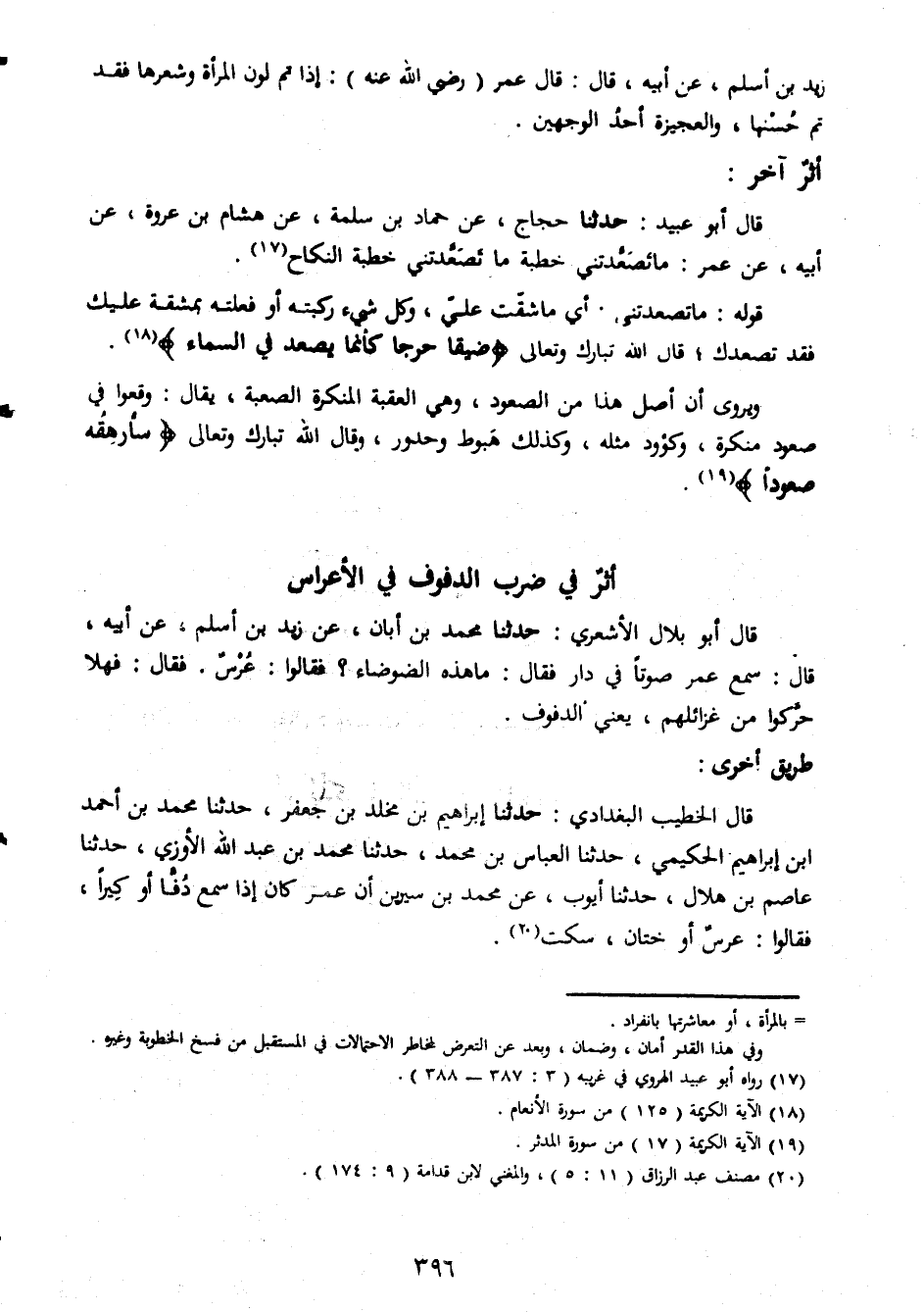 زيد بن اسلم عن ابيه قال قال عمر رضى الله عنه اذا تم لون المراة وشعرها فقد تم حسنها والعجيزة احد الوجهين أثر آخر قال ابو عبيد حدثنا حجاج عن حماد بن سلمة عن هشام بن عروة عن ابيه عن عمر ما تصعدتنى خطبة النكاح قوله ما تصعدتنى اى ما شقت على وكل شىء ركبته او فعلته بمشقة عليك فقد تصعدك قال الله تبارك وتعالى ضيقا حرجا كأنما يصعد فى السماء ويروى ان أصل هذا من الصعود وهو العقبة المنكرة الصعبة يقال وقعوا فى صعود منكرة وكوود مثله وكذلك هبوط وحدور وقال الله تبارك وتعالى سأرهقه صعودا أثر فى ضرب الدفوف فى الاعراس قال ابو بلال الاشعرى حدثنا محمد بن ابان عن زيد بن اسلم عن ابيه قال سمع عمر صوتا فى دار فقال ما هذه الضوضاء فقالوا عرس فقال فهلا حركوا من غزائلهم يعني الدفوف طريق اخرى قال الخطيب البغدادي حدثنا ابراهيم بن مخلد بن جعفر حدثنا محمد بن احمد ابن ابراهيم الحكيمى حدثنا العباس بن محمد بن عبد الله الاوزي حدثنا عاصم بن هلال حدثنا ايوب عن محمد بن سيرين ان عمر كان اذا سمع دفا او كبرا فقالوا عرس او ختان سكت