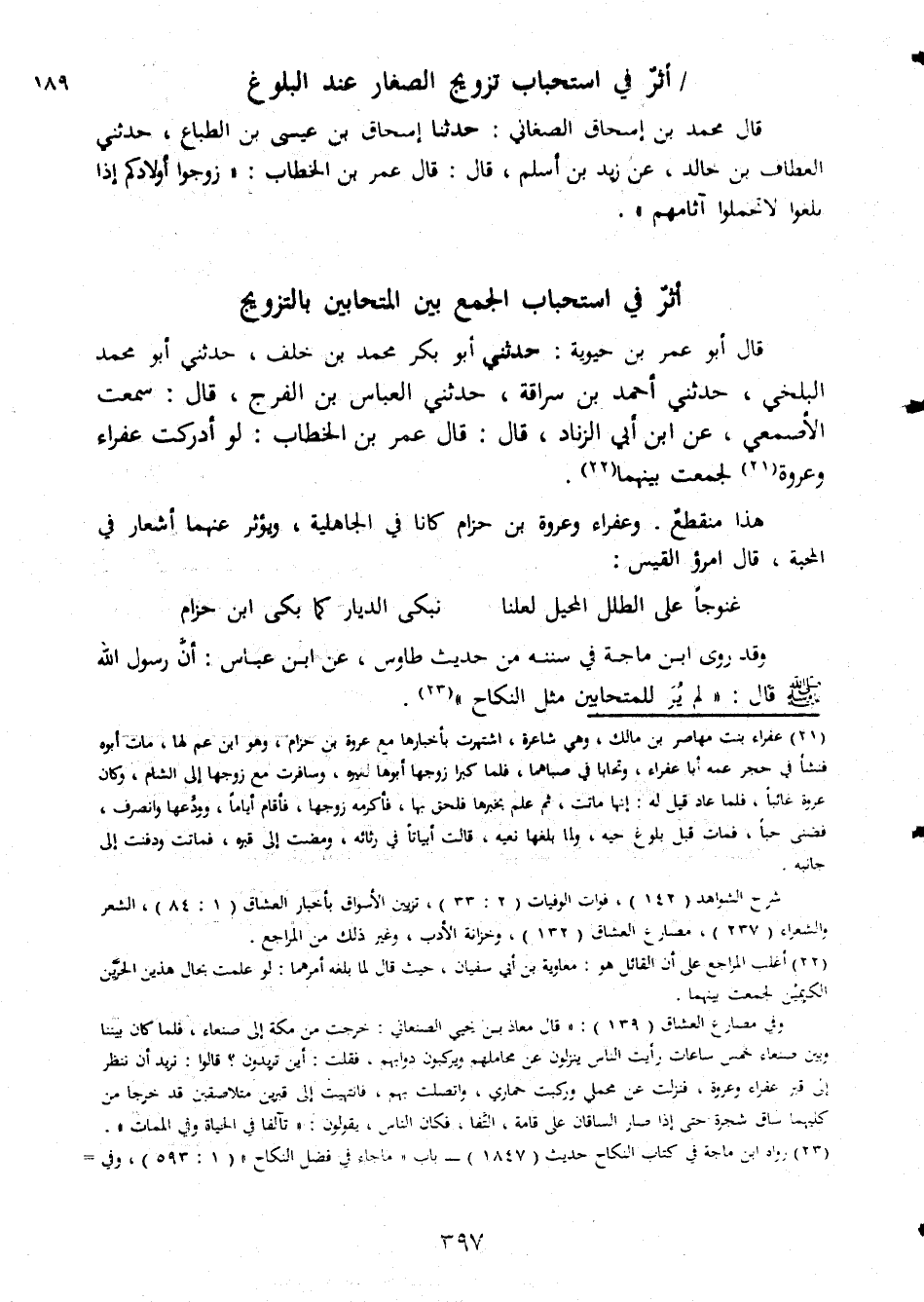 اثر فى استحباب تزويج الصغار عند البلوغ قال محمد بن اسحاق الصغاني حدثنا اسحاق بن عيسى بن الطباع حدثني العطاف بن خالد عن زيد بن اسلم قال قال عمر بن الخطاب زوجوا اولادكم اذا بلغوا لاتحملوا اثامهم اثر في استحباب الجمع بين المتحابين بالتزويج قال ابو عمر بن حيوية حدثنى ابو بكر محمد بن خلف حدثني ابو محمد البلخي حدثني احمد بن سراقة حدثني العباس بن الفرج قال سمعت الاصمعي عن ابن ابي الزناد قال قال عمر بن الخطاب لو ادركت عفراء وعروة لجمعت بينهما هذا منقطع وعفراء وعروة بن حزامكانا فى الجاهلية ويؤثر عنهما اشعار فى المحبة قال امرؤ القيس غنوجا على الطلل المحبل لعنا تبكى الديار كما بكى ابن حزام وقد روى ابن ماجة في سننه من حديث طاوس عن ابن عباس ان رسول الله صلى الله عليه وسلم قال لم ير للمتاحبين مثل النكاح