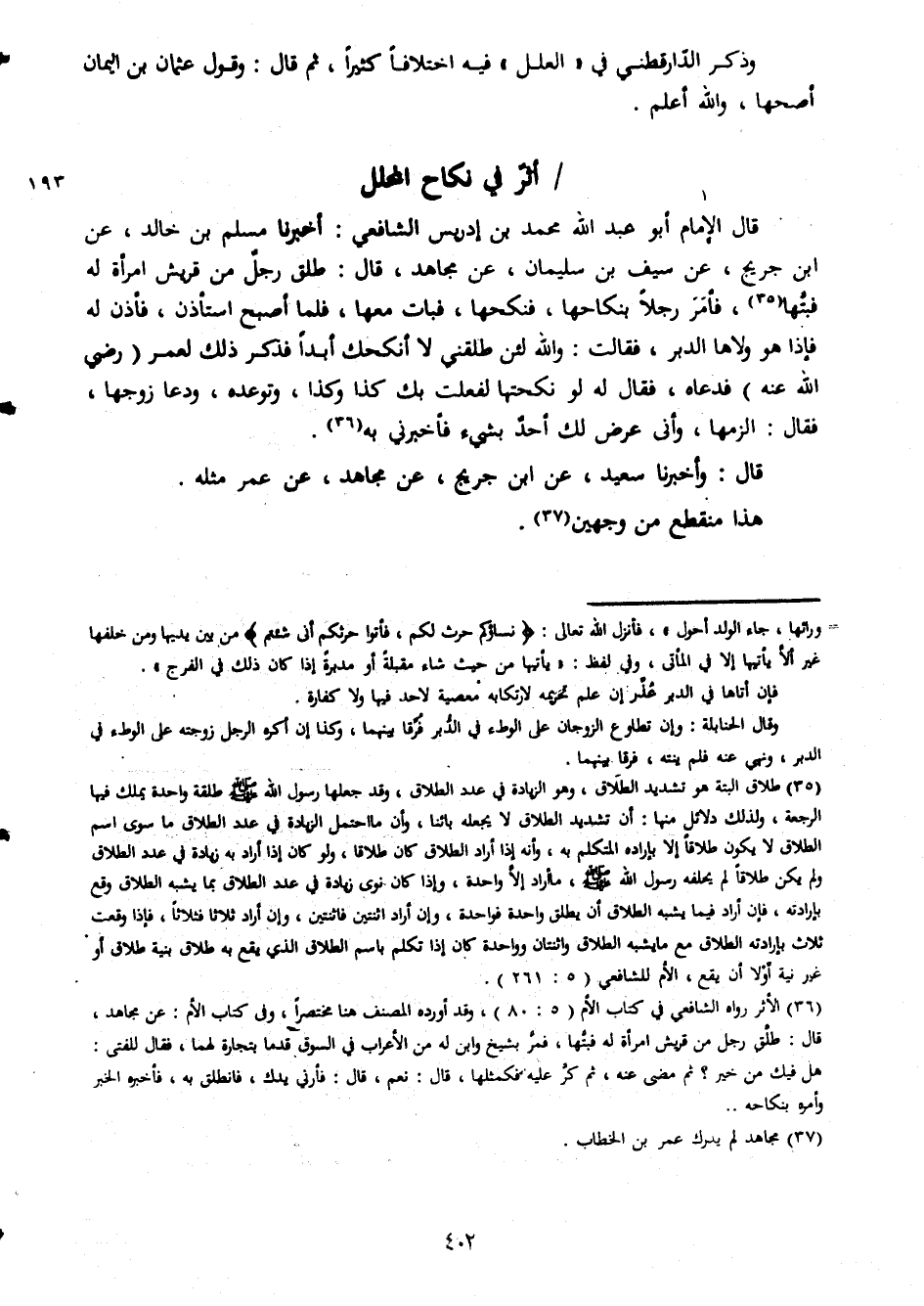 وذكر الدار قطنى فى العلل فيه اختلافا كثيرا ثم قال وقول عثمان بن اليمان اصحها والله اعلم اثر فى نكاح المحلل قال الامام ابو عبد اله محمد بن ادريس الشافعى اخبرنا مسلم بن خالد عن ابن جريح عن سيف بن سليمان عن مجاهد قال طلق رجل من قريش امرأة له فبتها فأمر رجلا بنكاحها فنكحها فبات معها فلما اصبح استأذن فأذن له فاذا هو ولاها الدبر فقالت والله لئن طلقنى لا انكح كابدا فذكر ذلك لعمر رضى الله عنه فدعاه فقال له لو نكحتها لفعلت بك كذاو كذا وتوعده ودعا زوجها فقال الزمها وانى عرض لك احد بشئ فأخبرنى به قال واخبرنا سعيد عن ابن جريح عن مجاهد عن عمر مثله هذا منقطع من وجهين