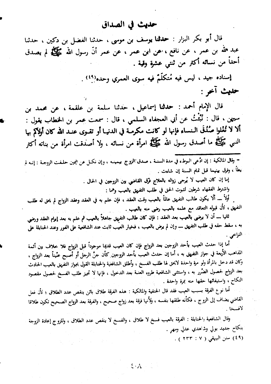 حدثنا فى الصداق قال ابوبكر البزار حدثنا يوسف بن موسى حدثنا الفضل بن دكين حدثنا عبد الله بن عمر عن نافع عن ابن عمر عن عمر ان رسول الله صلى الله عليه وسلم لم يصدق احدا من نسائه اكثر من ثنتى عشرة وقية اسناده جيد ليس فيه متكلم فيه سوى العمرى وحده حديث اخر قال الامام احمد حدثنا اسماعيل حدثنا سلمة بن علقمة عن محمد بن سيرين قال نبئت عن ابى العجفاء السلمى قال سمعت عمر بن الخطاب يقول الا لا تغلوا صدق النساء فإنها لو كانت مكرمة فى الدنيا او تقوى عند الله كان اولادكم بها النبى صلى الله عليه وسلم ما اصدق رسول الله صلى الله عليه وسلم امراة من نسائه ولا اصدقت امراة من بناته اكثر