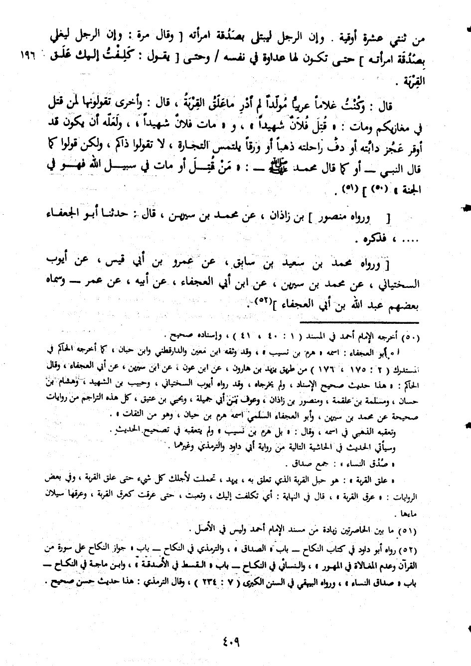 من ثنتى عشرة اوقية وان الرجل ليبتلى بصدقة امراته وقال مرة وان الرجل ليغلى بصدقه امراته حتى تكون لها عداوة فى نفسه وحتى يقول كلفت اليك علق القربة قال وكنت غلاما عربيا مولدا لم ادر ما علق القربة قال واخرى تقولونها لمن قتل فى مغازيكم ومات قتل فلان شهيدا ومات فلان شهيدا ولعله ان يكون قد اوقر عجز دابته او دف راحلته ذهبا او ورقا يلتمس التجارة لا تقولوا ذاكم ولكن قولوا كما قال النبى او كما قال محمد صلى الله عليه وسلم من قتل او مات فى سبيل الله فهو فى الجنة ورواه منصور بن زادان عن محمد بن سيرين قال حدثنا ابو الجعفاء فذكره ورواه محمد بن سعيد بن سابق عن عمرو بن ابى قيس عن ايوب السخيتانى عن محمد بن سيرين عن ابن ابى العجفاء عن ابيه عن عمر وسماه بعضهم عبد الله بن ابى العجفاء