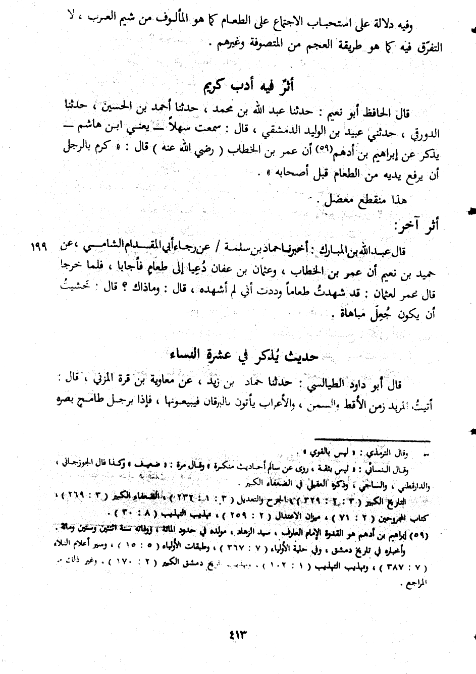 وفيه دلالة على استحباب الاجتماع على الطعام كما هو المألوف من شيم العرب لا التفرق فيه طريقة العجم من المتصوفة وغيرهم أثر فيه أدب كريم قال الحافظ ابو نعيم حدثنا عبد الله بن محمد حدثنا احمد بن الحسين حدثنا الدورقى حدثنى عبيد بن الوليد الدمشقى قال سمعت سهلا يعنى ابن هاشم بن يذكر عن ابراهيم بن ادهم أن عمر بن الخطاب رضى الله عنه قال كرم بالرجل ان يرفع يديه من الطعام قبل اصحابه هذا منقطع معضل أثر آخر قال عبد الله بن المبارك اخبرنا حماد بن سلمة عن رجاء ابى المقدام الشامى عن حميد بن نعيم ان عمر بن الخطاب وعثمان بن عفان دعيا الى طعام فأجابا فلما خرجا قال عمر لعثمان قد شهدت طعاما وددت انى لم اشهده قال وماذاك قال خشيت ان يكون جعل مباهاة حديث يذكر فى عشرة النساء قال ابو داود الطيالسى حدثنا حماد بن زيد عن معاوية بن قرة المزنى قال اتيت المريد زمن الاقط والسمن والاعراب ياتون بالبرقان فيبيعونها فإذا برجل طامح بصره