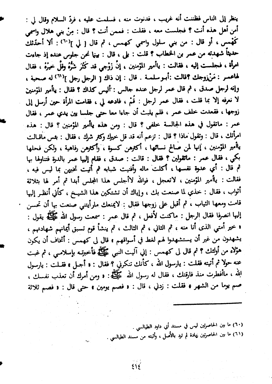 ينظر الى الناس فظننت انه غريب فدنوت منه فسلمت عليه فرد السلام وقال لى امن اهل هذه انت فجلست معه فقلت فمن انت قال من بنى هلال واسمى كهمس او قال من بنى سلول واسمى واسمى كهمس ثم قال لى الا احدثك حديثا شهدته من عمر بن الخطاب قلت بلى بينما نحن جلوس عنده اذ جاءت امراة فجلست اليه فقالت يا امير المؤمنين ان زوجى قد كثرة شره وقل خيره فقال لها عمر من زوجك قالت ابو سلمة قال ان ذاك الرجل رجل له صحبه وانه لرجل صدق ثم قال عمر لرجل عنده جالس اليس كذلك فقال يا امير المؤمنين لا نعرفه الا بما قلت فقال عمر لرجل قم فادعه لى فقامت المراة حين ارسل الى زوجها فقعدت خلف عمر فلم يلب ثان جاءا معا حتى جلسا بين يدى عمر فقال عمر ما تقول فى هذه الجالسة خلفى قال ومن هذه يا امير المؤمنين قال هذه امراتك قال وتقول ماذا قال تزعم انه قد قل خيرك وكثر شرك فقال بئس ما قالت يا أمير المؤمنين انها لن صالح نسائها أكثرهن كسوة وأكثرهنرفاهية ولكن فحلها بكى فقال عمر ما تقولين فقال قالت صدق فقام اليها عمربالدرة فتنولها بها ثم قال اى عدوة نفسها أكلت ماله وافنيت شبابه ثم اتيت تخبرين بما ليس فيه فقالت يا امير المؤمنين لا تعجل فو الله لا اجلس هذا المجلس ابدا ثم امر لها بثلاثة اثواب فقال خذى لما صنعت بك واياك ان تشتكين هذا الشيخ كأنى انظر اليها قامت ومعها الثياب ثم اقبل على زوجها فقال لا يمنعك ما رأيتنى صنعت بها ان تحسن اليها انصرفا فقال الرجل ما كنت لأفعل ثم قال عمر سمعت رسول الله صلى الله عليه وسلم يقول خير امتى الذى انا منه ثم الثانى ثم الثالث ثم ينشأ قوم تسبق ايمانهم شهادتهم يشهدون من غير ان يستشهدوا لهم لغط فى اسواقهم قال لى كهمس اتخاف ان يكون هؤلاء من أولئك ثم قال لى كهمس انى آليت النبى صلى الله عليه وسلم فأخبرته بإسلامى ثم غبت عنه حولا ثم أتيته فقلت يا رسول الله كأنك تنكرنى فقال اجل فقلت يا رسول الله ما أفطرت منذ فارقتك فقال له رسول الله صلى الله صلى الله عليه وسلم ومن امرك ان تعذب نفسك صم يوما من الشهر فقلت زدنى قال فصم يومين حتى قال فصم ثلاثة