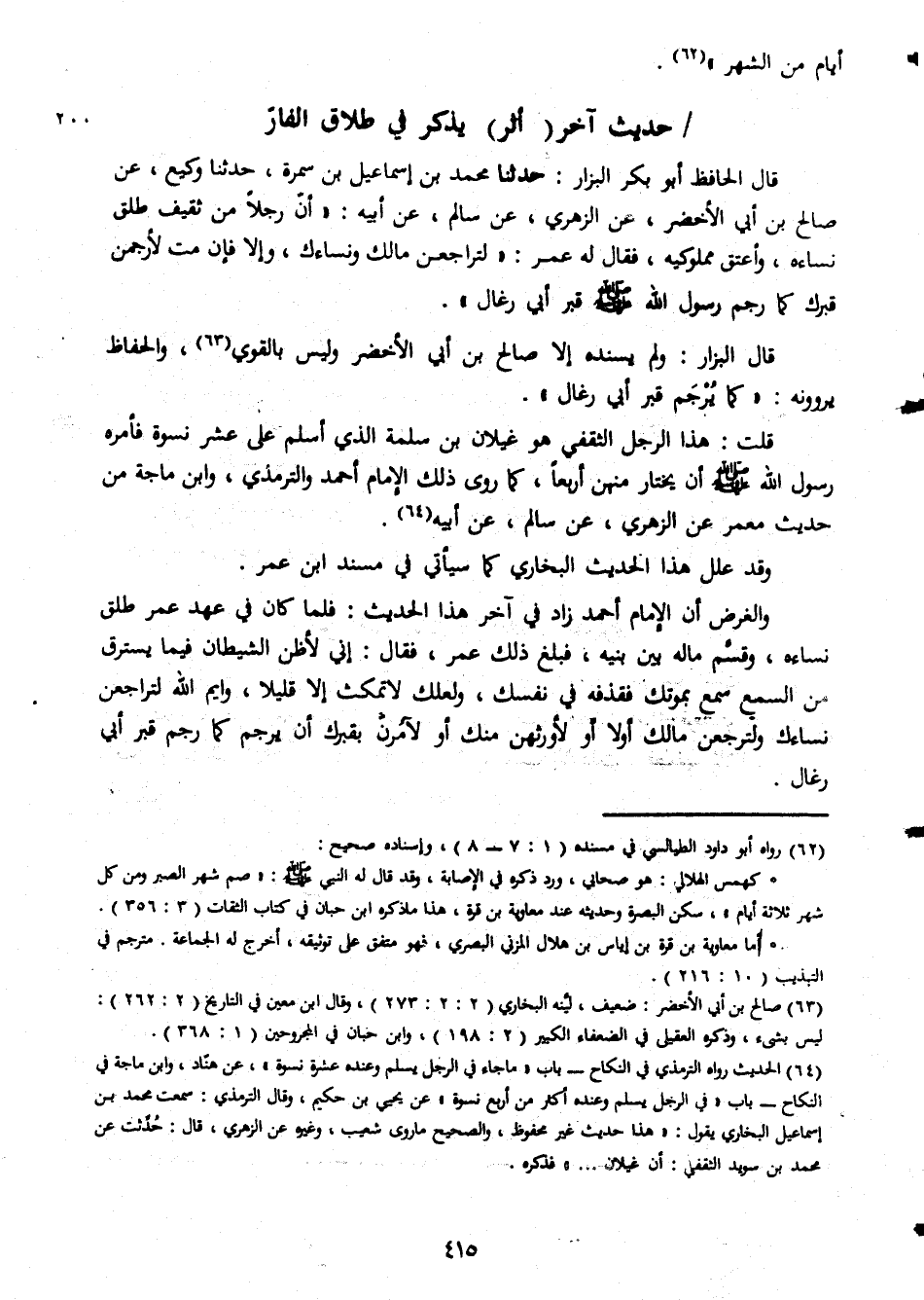 أيام من الشهر حديث آخر أثر يذكر فى طلاق الفار قال الحافظ ابو بكر البزار حدثنا محمد بن اسماعيل بن سمرة حدثنا وكيع عن صالح بن ابى الاخضر عن الزهرى عن سالم عن ابيه ان رجلا من ثقيف طلق نساءه وأعتق مملوكيه فقال له عمر لتراجعن مالك ونساءك والا فإن مت لأرجمن قبرك كما رجم رسول الله صلى الله عليه وسلم قبر ابى رغال قال البزار ولم يسنده الا صالح بن ابى الاخضر وليس بالقوى والحفاظ يروونه كما يرجم قبر ابى رغال قلت هذا الرجل الثقفى هو غيلان بن سلمة الذى اسلم على عشر نسوة فأمره رسول الله صلى الله عليه وسلم ان يختار منهن اربعا كما روى ذلك الامام احمد والترمذى وابن ماجة من حديث معمر عن الزهرى عن سالم عن ابيه وقد علل هذا الحديث البخارى كما سيأتى فى مسند ابن عمر والغرض ان الامام احمد زاد فى آخر هذا الحديث فلما كان فى عهد عمر طلق نساءه وقسم ماله بين بنيه فبلغ ذالك عمر فقال انى لاظن الشيطان فيما يسترق من السمع سمع بموتك فقذفه فى نفسك ولعلك لا تمكث الا قليلا وايم الله لتراجعن نساءك ولترجعن مالك اولا او لأورثهن منك او لأمرن بقبرك ان يرجم كما رجم قبر ابى رغال