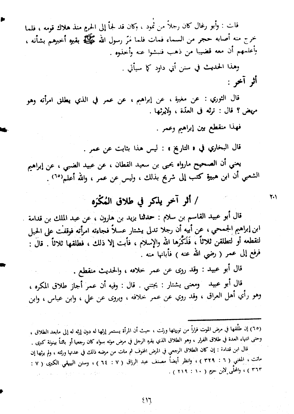 قلت وابو رغال كان رجلا من ثمود وكان قد لجا الى الحرم منذ هلاك قومه فلما خرج منه أصابه حجر من السماء فما مر رسول الله صلى الله عليه وسلم بقبره أخبرهم بشأنه وأعلمهم ان معه قضيبا من ذهب فنبشوا عنه وأخذوه وهذا الحديث فى سنن أبى داود كما سيأتى أثر آخر قال الثورى عن مغيرة عن ابراهيم عن عمر فى الذى يطلق امراته وهو مريض قال ترثه فى العدة ولا يرثها فهذا منقطع بين ابراهيم وعمر قال البخارى فى التاريخ ليس هذا بثابت عن عمر يعنى ان الصحيح ما رواه يحيى بن سعيد القطان عن عبيد الضبى عن ابراهيم الشعبى ان ابن هبيرة مت بالى شريح بذلك وليس عن عمر والله اعلم أثر آخر يذكر فى طلاق المكرة قال ابو عيبد القاسم بن سلام حدثنا يزيد بن هارون عن عبد الملك بن قدامة ابن ابرهيم الجمحى عن ابيه ان رجلا تدلى يشتار عسلا فجاءته امراته فوقفت على الحبل لتقطعه او لتطلقن ثلاثا فذكرها الله والاسلام فأبت الا ذلك فطلقها ثلاثا قال فرفع الى عمر رضى الله عنه فأبانها منه قال ابو عبيد وقد روى عن عمر خلافة والحديث منقطع قال ابو عبيد ومعنى يشتار يجتنى قال وفيه ان عمر اجاز طلاق المكره وهو راى اهل العراق وقد روى عن عمر خلافة ويروى عن على وابن عباس وابن