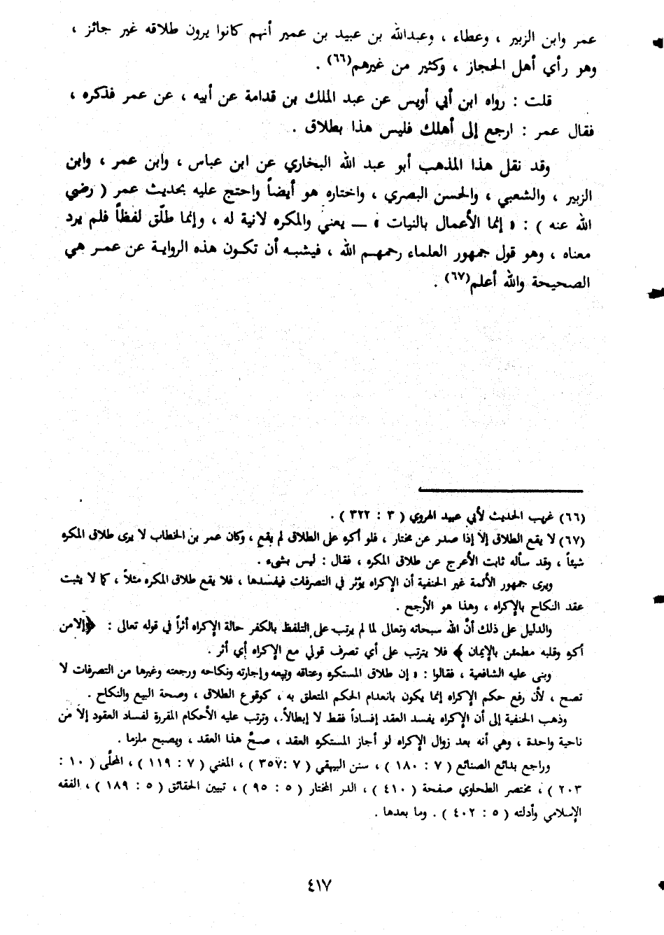 عمر وابن الزبير وعطاء وعبد الله بن عبيد بن عمير انهم كانوا يرون طلاقه غير جائز وهو رأى أهل الحجاز وكثير من غيرهم قلت رواه ابن ابى اويس عن عبد الملك بن قدامة عن ابيه عن عمر فذكره فقال عمر ارجع الى اهلك فليس هذا بطلاق وقد نقل هذا المذهب ابو عبد الله البخارى عن ابن عباس وابن عمر وابن الزبير والشعبى والحسن البصرى واختاره هو ايضا واحتج عليه بحديث عمر رضى الله عنه وانما الاعمال بالنيات يعنى والمكره لانية له وانما طلق لفظا فلم يرد معناه وهو قول مجهور العلماء رحمهم الله فيشبه ان تكون هذه الرواية عن عمر هى الصحيحة والله اعلم