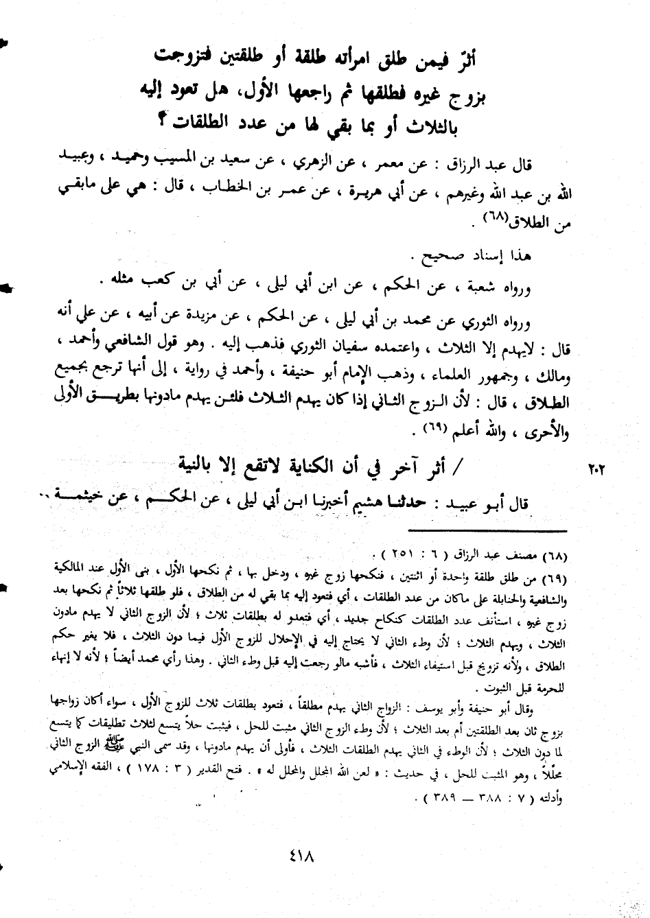 أثر فيمن طلق امراته طلقة او طلقتين فتزوجت بزوج غيره فطلقها ثم راجعها الاول هل تعود اليه بالثلاث او بما بقى لها من عدد الطلقات قال قال عبد الرزاق عن معمر عن الزهرى عن سعيد بن المسيب وحميد وعبيد الله بن عبد الله وغيرهم عن ابى هريرة عن عمر بن الخطاب قال هى على ما بقى من الطلاق هذا اسناد صحيح ورواه شعبه عن الحكم عن ابن ابى ليلى عن ابى بن كعب مثله ورواه الثورى عن محمد بن ابى ليلى عن الحكم عن مزيدة عن ابيه عن على انه قال لا يهدم الا الثلاث واعتمده سفيان الثورى فذهب اليه وهو قول الشافعى واحمد ومالك وجمهور العلماء وذهب الامام ابو حنيفة واحمد فى رواية الى انها ترجع بجميع الطلاق قال لأن الزوج الثانى اذا كان يهدم الثلاث فلئن يهدم مادونها بطريق الاولى والاخرى والله اعلم أثر آخر فى ان الكناية لا تقع الا بالنية قال ابو عبيد حدثنا هشيم اخبرنا ابن ابى ليلى عن الحكم عن خثيمة