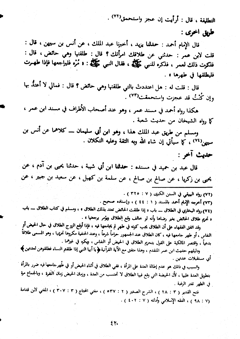 التطليقة قال ارايت ان عجز واستحمق طريق اخرى قال الامام احمد حدثنا يزيد اخبرنا عبد الملك عن انس بن سيرين قال قلت لابن عمر حدثنى عن طلاقك امراتك قال طلقتها وهى حائض قال فذكرت ذلك لعمر فذكره النبى صلى الله عليه وسلم فقال النبى صلى الله عليه وسلم مره فليراجعها فإذا طهرت فليطلقها فى طهرها قال قلت له هل اعتددت بالتى طلقتها وهى حائض قال فمالى لا اعتد بها وان كنت قد عجزت واستحقت هكذا رواه احمد فى مسند عمر وهو عند اصحاب الاطراف فى مسند ابن عمر كما رواه الشيخان من حديث شعبة ومسلم من طريق عبد الملك هذا وهو ابن ابى سليمان كلاهما عن انس بن سييرين كما سيأتى ان شاء الله وبه الثقة وعليه التكلان حديث آخر قال عبد بن حميد فى مسنده حدثنا ابن ابى شيبة حدثنا يحيى بن ادم عن يحيى بن زكريا عن صالح بن صالح عن سلمة بن كهيل عن سعيد بن جبير عن